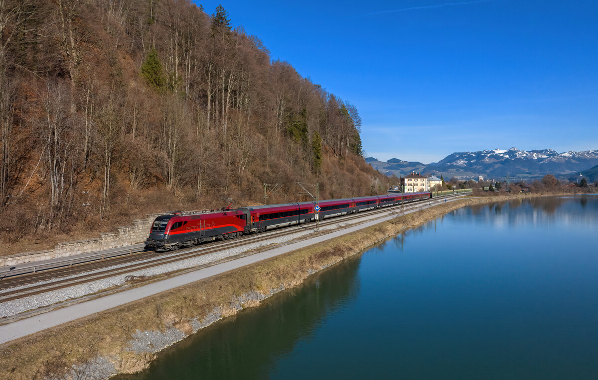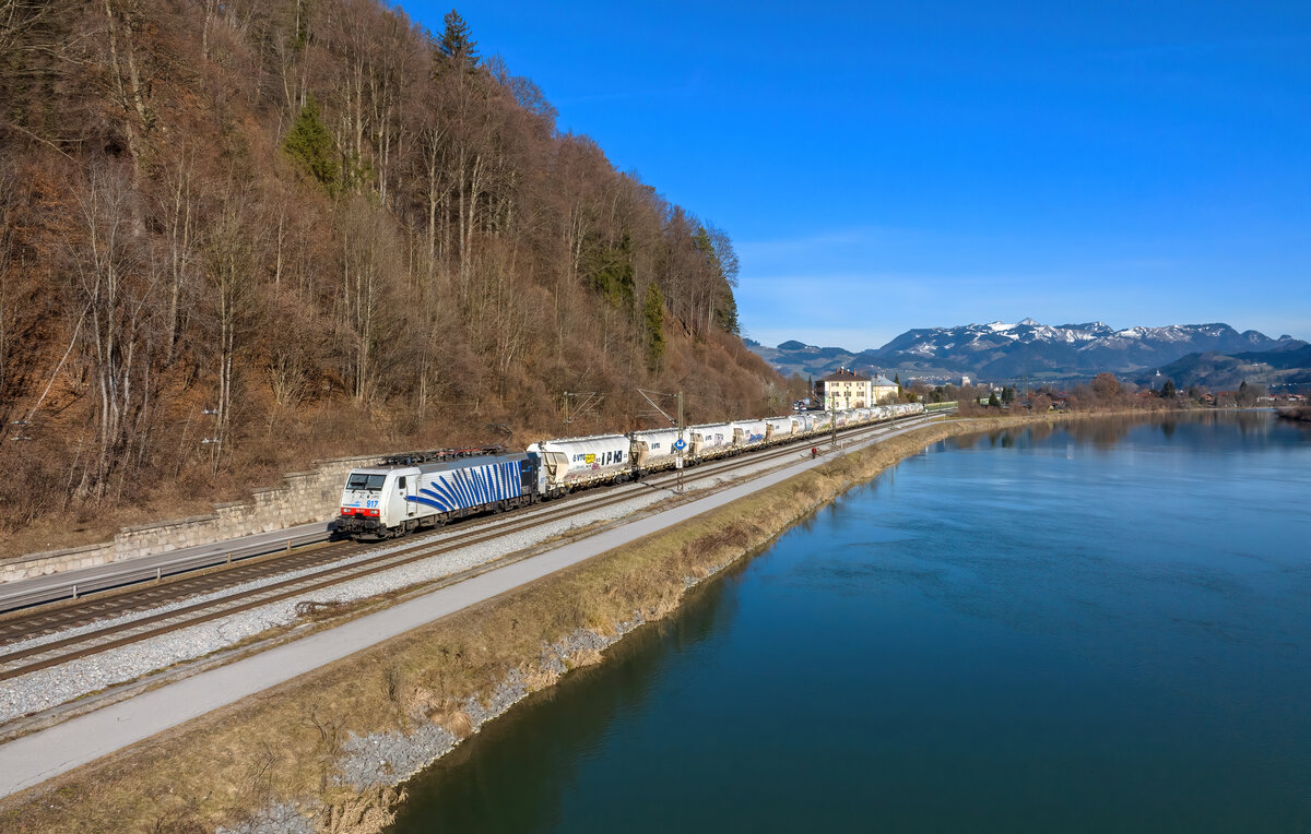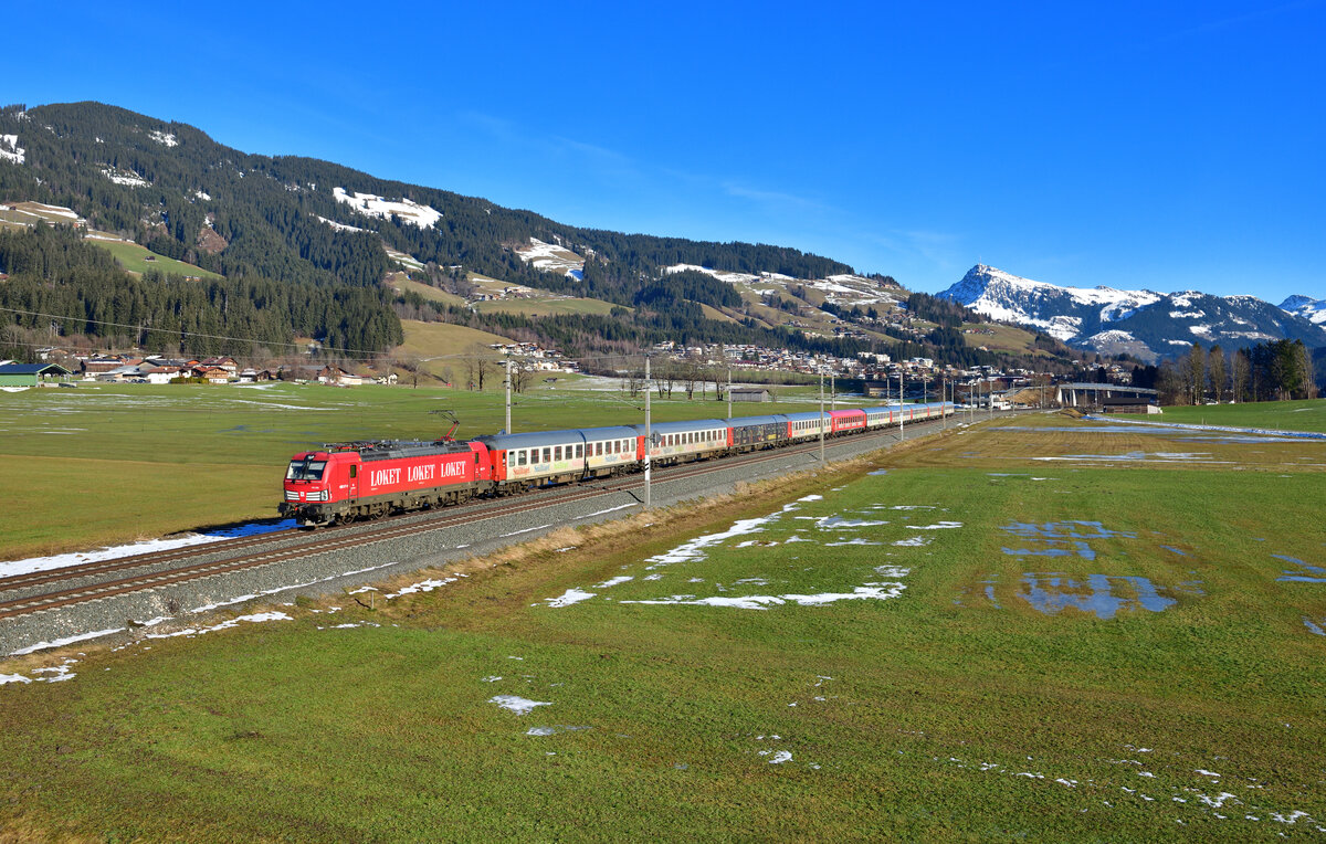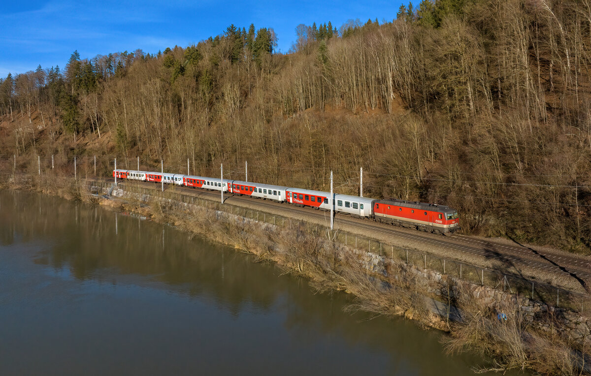 Mit dem EC 88 aus Bologna Centrale überquerte die  Weltrekordlok  1216 025 am 29.01.2024 die Innbrücke kurz vor dem Bahnhof Brixlegg auf ihrer Fahrt nach München Hbf Gl. 5-10.