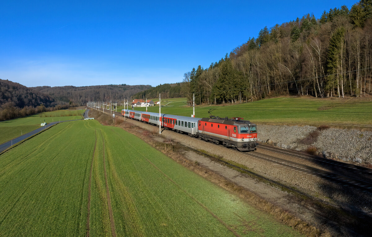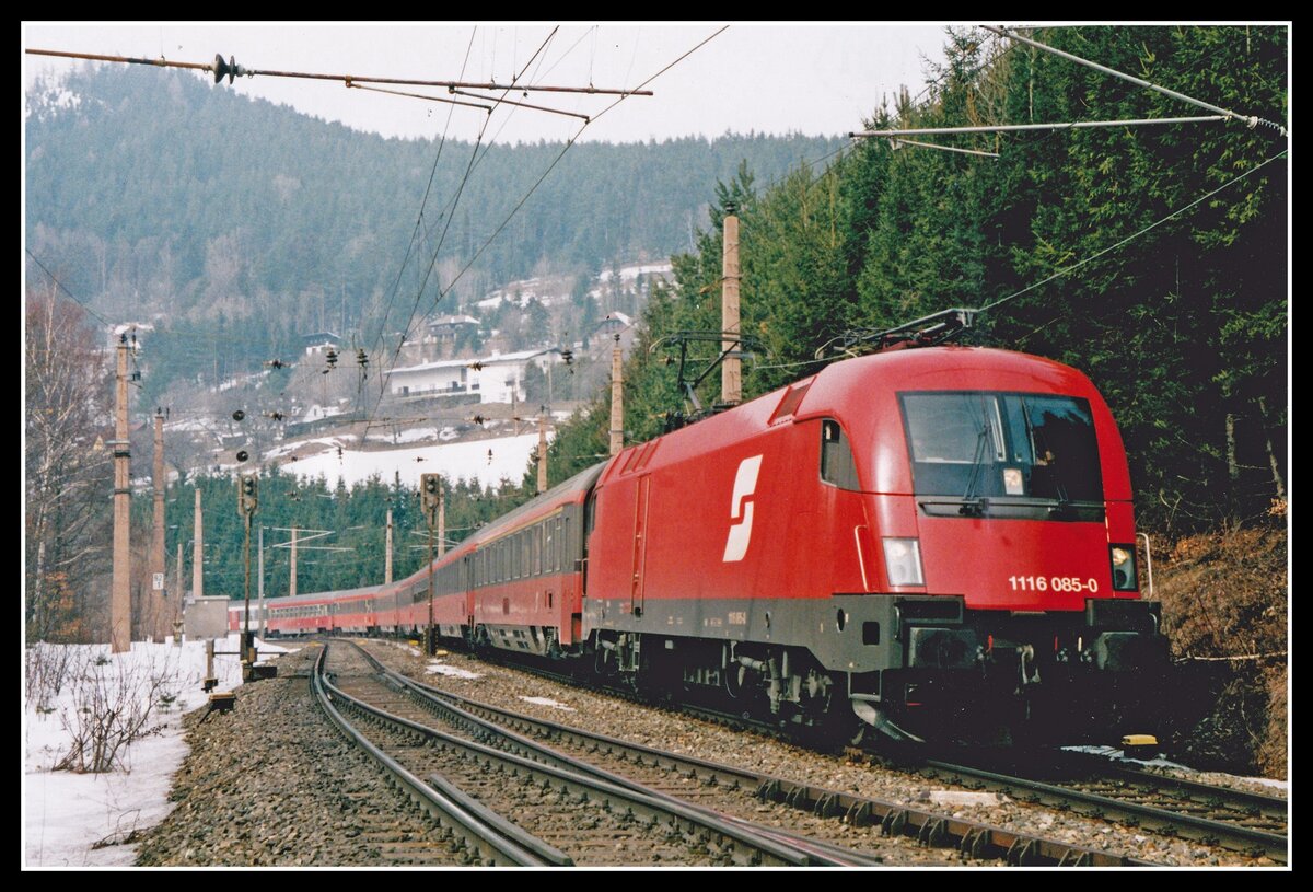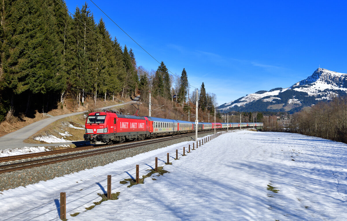 Mit dem EC 88 aus Bologna Centrale überquerte die  Weltrekordlok  1216 025 am 29.01.2024 die Innbrücke kurz vor dem Bahnhof Brixlegg auf ihrer Fahrt nach München Hbf Gl. 5-10.
