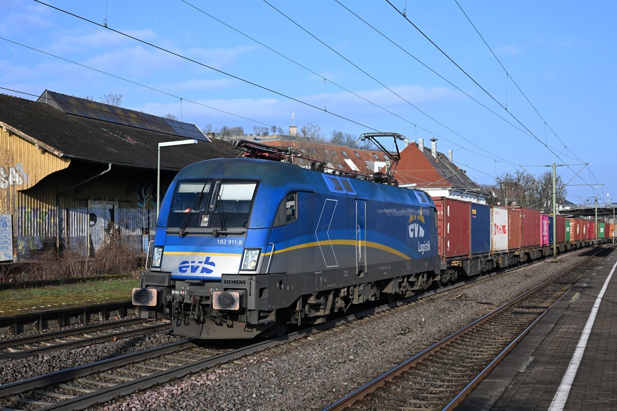 Ulm Hauptbahnhof - Durchfahrt eines Containerzuges auf Gleis 1. Auf Gleis 2 wird gleich der EC 219 nach Graz abfahren. Die Aufnahme dient nur als Ergänzung zum nächsten Bild, wo der Zug den Bahnhof im Zickzack verlässt. Schon einiger Zeit vorher konnte ich den Zug im Hintergrund sehen, dann verschwand er aus dem Blickfeld bis er dann auf Gleis 1 einfuhr. 21.02.2024 (M)