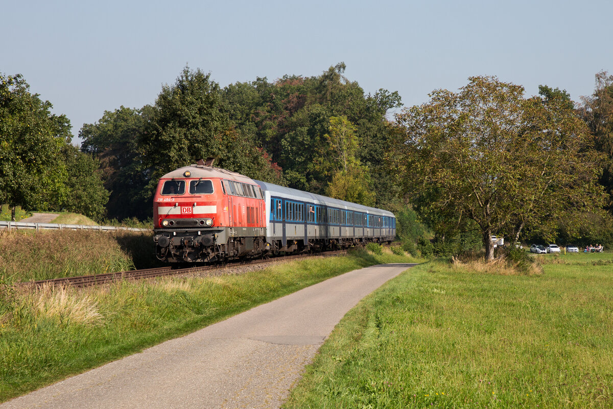 218 494 zieht den Freizeitexpress (FEX) nach Singen. Die Freizeitverkehre werden von der SVG betrieben. Hier bei Stahringen am 09.09.2023