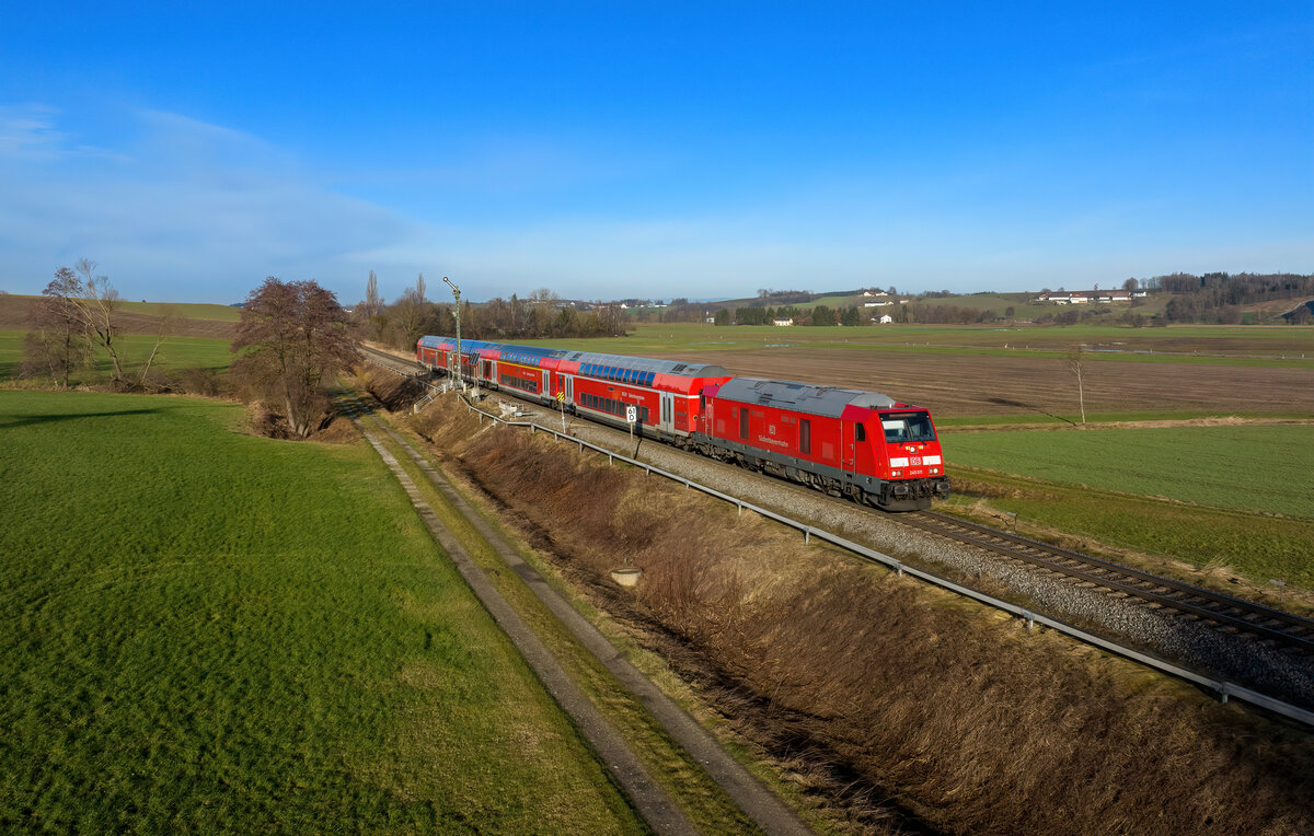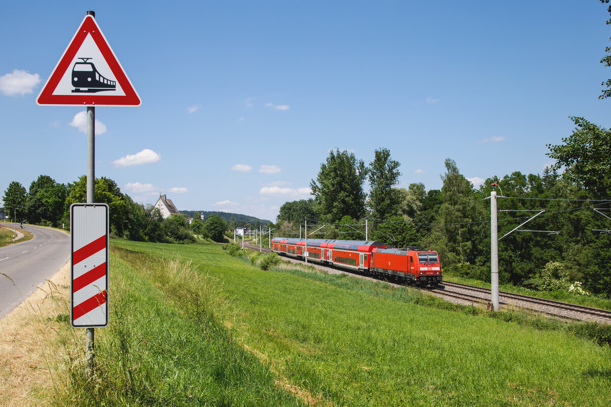 Ein RE5 von Stuttgart nach Friedrichshafen Stadt. Hier südlich des Bahnhofes von Aulendorf. 11.06.2023