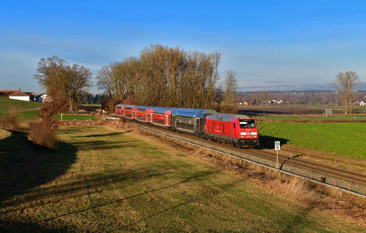 Ein RE5 von Stuttgart nach Friedrichshafen Stadt. Hier südlich des Bahnhofes von Aulendorf.