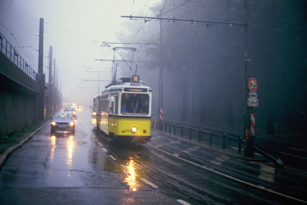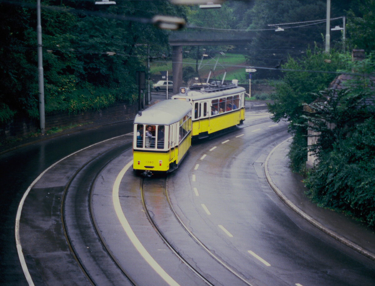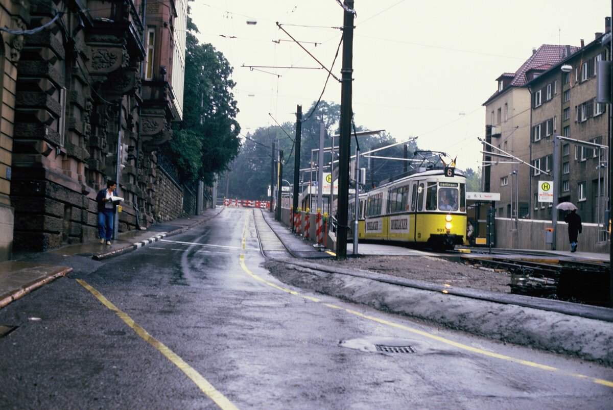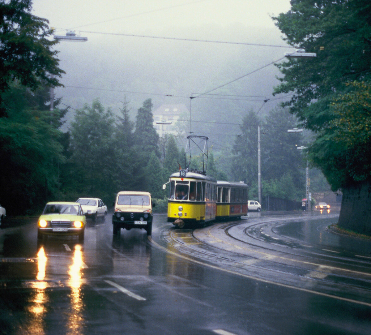 Der heftige Regen bestimmte das Geschehen der Sonderfahrt zu Ehren der Eröffnung der neuen Stuttgarter Stadtbahnlinie nach Möhringen (hoch über der Straße der Neuen Weinsteige). Mitten a u f der Straße der Neuen Weinsteige kämpfte sich der Sonderzug mit TW 802 (MF Esslingen Serie T2) und Beiwagen (Serie B2) den Berg hinauf. Volle Straßenbahnwagen, volle Straße, viel Wasser auf der Straße, schnelle Autofahrer, viel Wehmut, zusammen mit hohem fahrerischen Können der Fahrer der historischen Straßenbahnzüge, das war eine sonderbare Kombination. Der Tag hätte ein riesiges Unglück bewirken können, und wir waren danach wirklich richtig happy, dass es nicht eintrat. Ich vermute, dass es danach in Stuttgart nie wieder einen solch schwierigen Tag für die historischen Straßenbahnen gab.