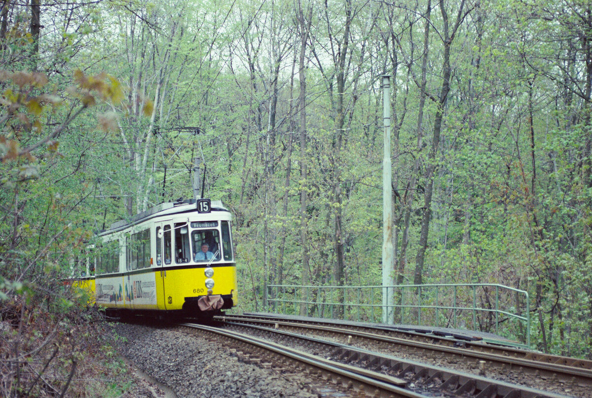 Die Stuttgarter Straßenbahnlinie 15 war zwischen Ruhbank und Stelle so etwas wie eine Waldstraßenbahn, so auch hier mit einem Zug aus zwei GT4, es war 1983.