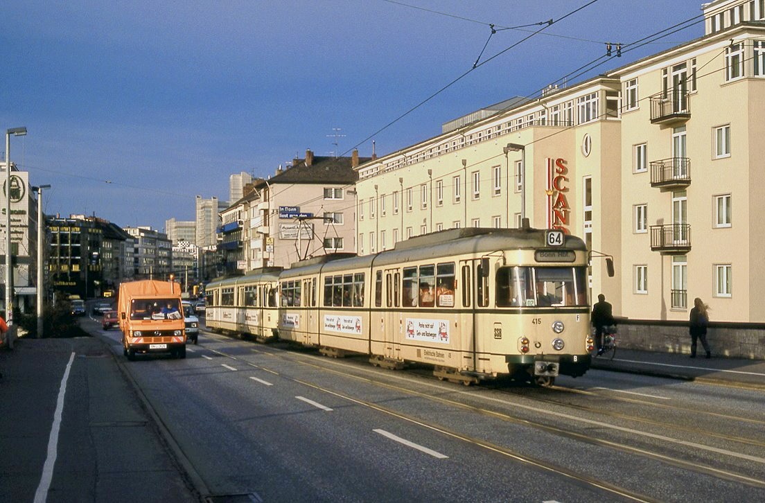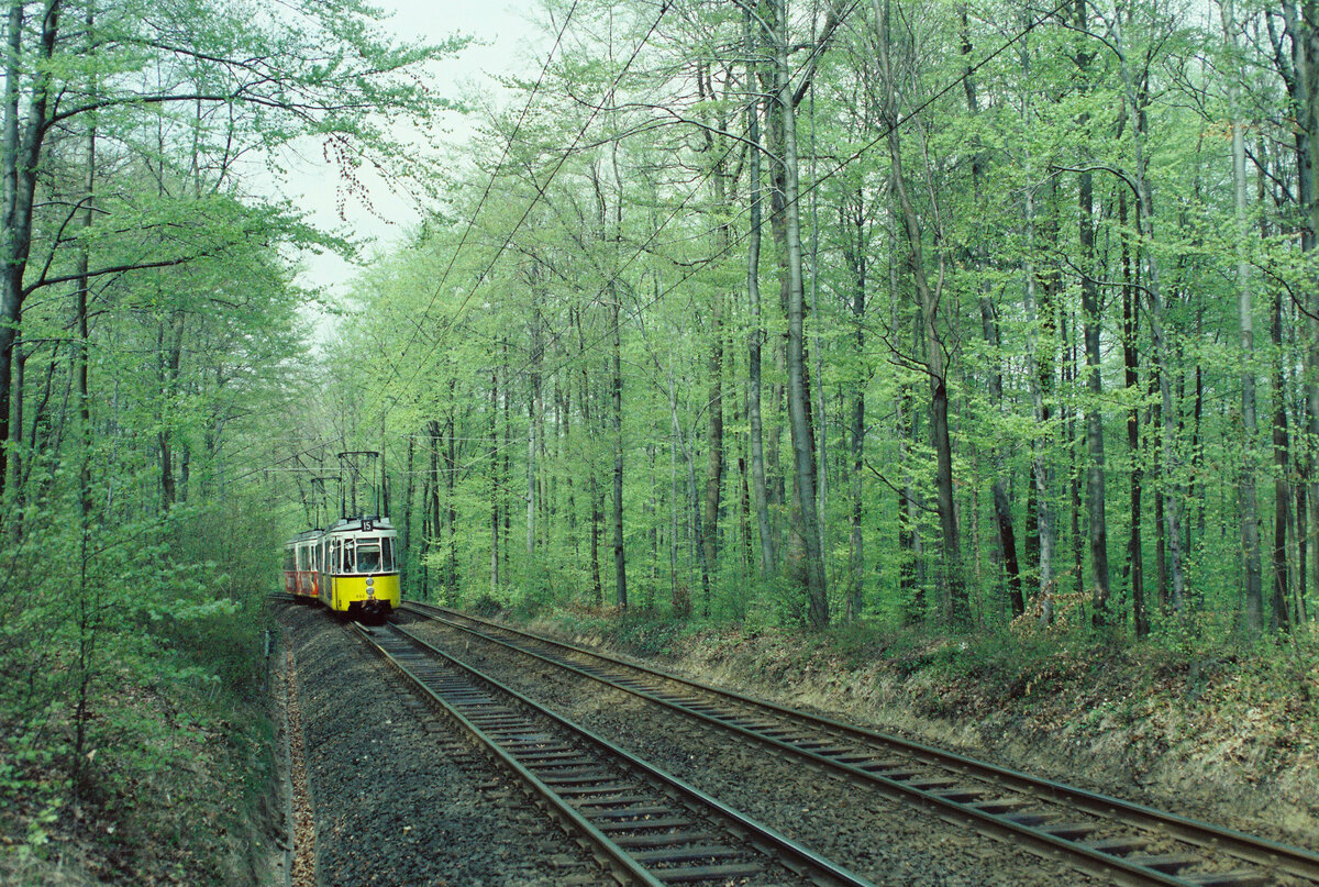 Auch für Straßenbahnfahrer war das Waldstück der Stuttgarter Linie 15 immer eine echte Aufgabe, da die Steigung sehr ausgeprägt war und das Laub auf den Schienen vor allem bei Regen für einen oft sehr langen Bremsweg sorgte. Hier überwindet ein Zug aus zwei GT4 die Steigung zwischen Stelle und Ruhbank, es war 1983.