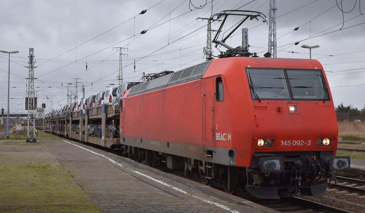 HSL Logistik GmbH, Hamburg [D] mit der angemieteten BRLL Lok  145 092-3  [NVR-Nummer: 91 80 6145 092-3 D-BRLL] verlässt den BLG-Stützpunkt Falkenberg/Elster mit einem PKW-Transportzug Richtung Süden, 20.02.24