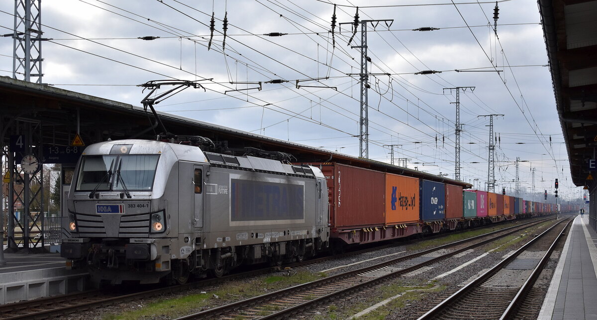 Durchfahrt eines Containerzuges auf Gleis 1. Auf Gleis 2 wird gleich der EC 219 nach Graz abfahren.