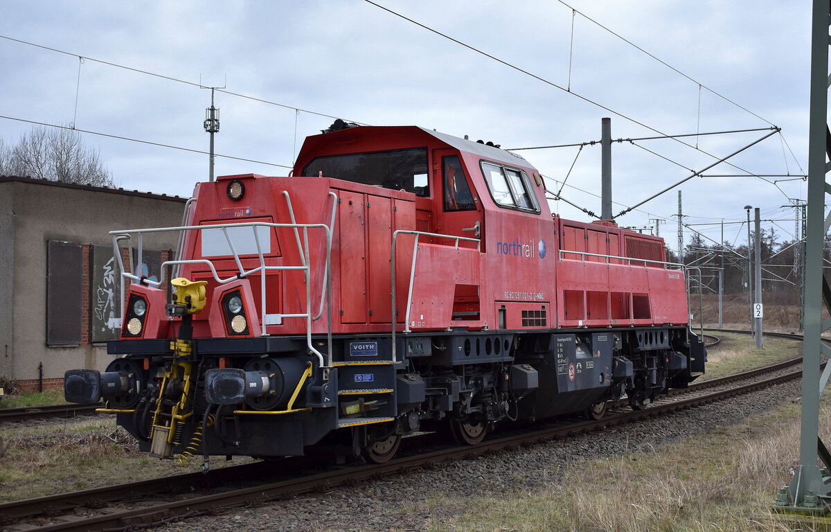 Die Northrail GmbH, Hamburg [D] MaK G 1206 Lok, Name: "Franci" [NVR-Nummer: 92 80 1276 015-5 D-NRAIL], aktueller Mieter? steht mit einem Gleisbauzug am Rande des Bahnhof Rathenow abgestellt, 21.02.24