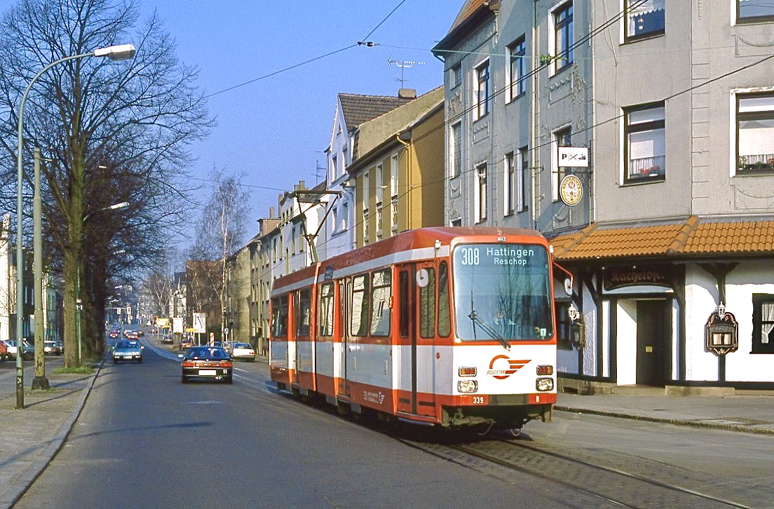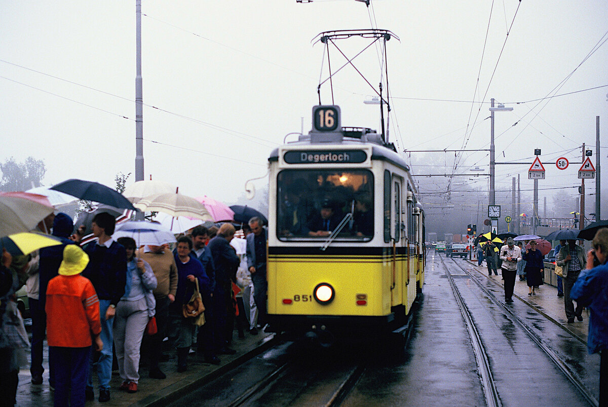 Sonderfahrt zu Ehren der Eröffnung der neuen Stadtbahnlinie neben der Straße der Neuen Weinsteige: TW 851 (Uerdingen) und BW 1390 werden gleich an der Station sehr voll werden! Es war übrigens erstaunlich, mit welcher Leichtigkeit die beiden schon sehr alten Straßenbahnzüge bei einem solchen Regentag alles bewältigen konnten.