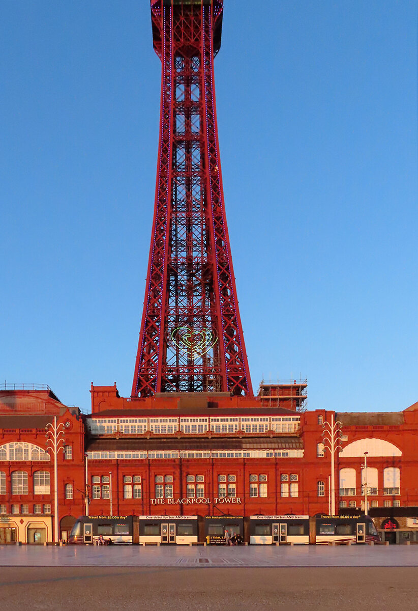 Suchbild: wo ist die Strassenbahn? Flexity-Tram in der Abendsonne vor dem Blackpool-Tower. Blackpool, 11.5.2022