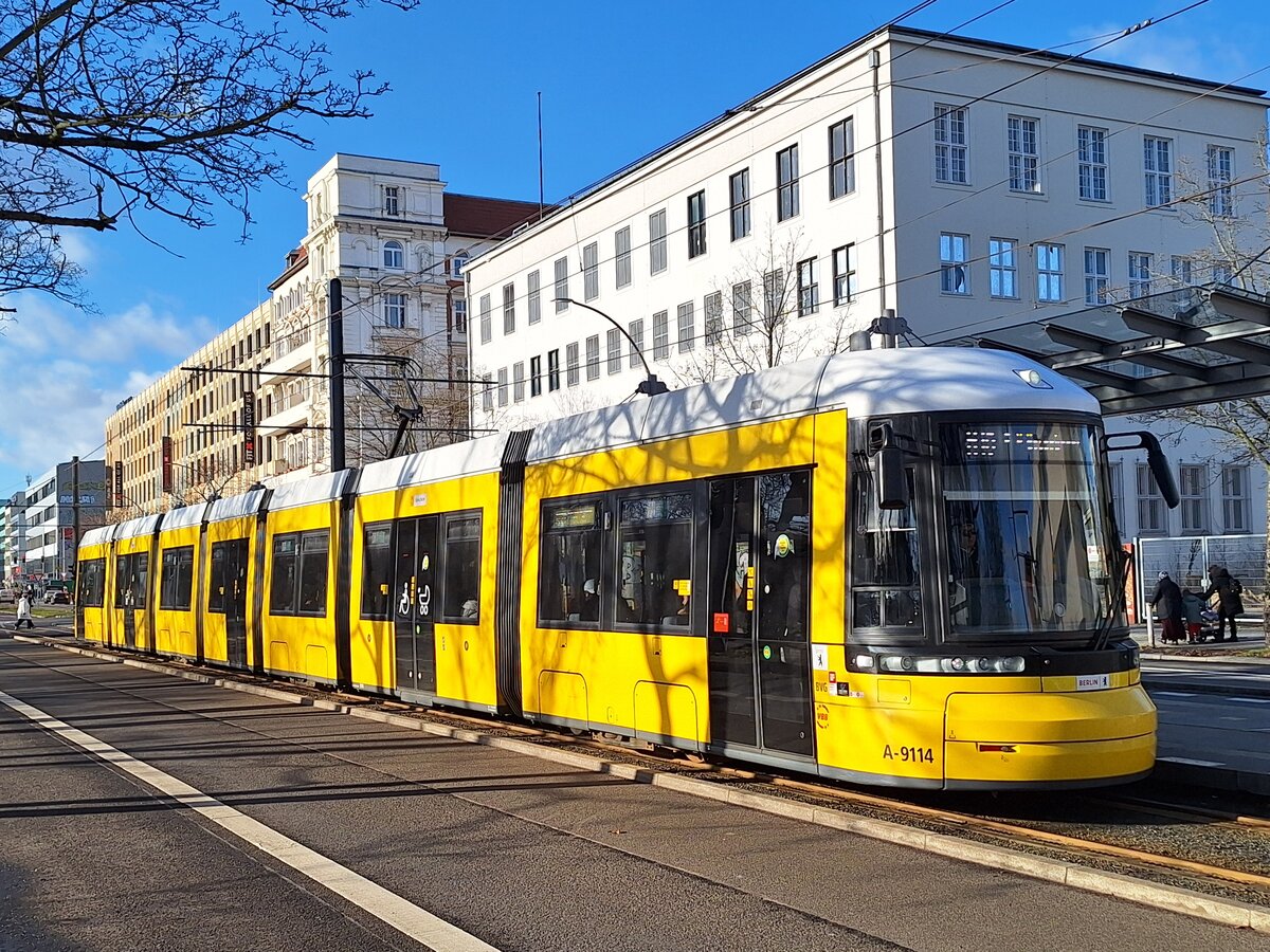 Wagen 9114 am 01.02.2024 um 13:44 Uhr als M10 an der Haltestelle  Lübecker Straße  in Richtung Hauptbahnhof.