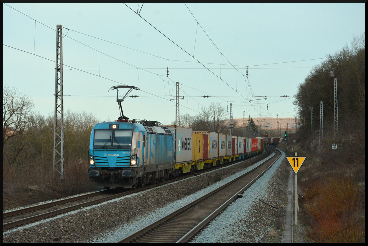 Ich hatte mich bewusst in Blickrichtung auf diese Gleis aufgestellt, nicht ahnend dass die hinteren Wagen leer sind. So geht der Blick über diese Wagen hinweg nach vorne zu den Containern und man kann schön den Verlauf des Zuges mit seinen Richtungsänderungen verfolgen.