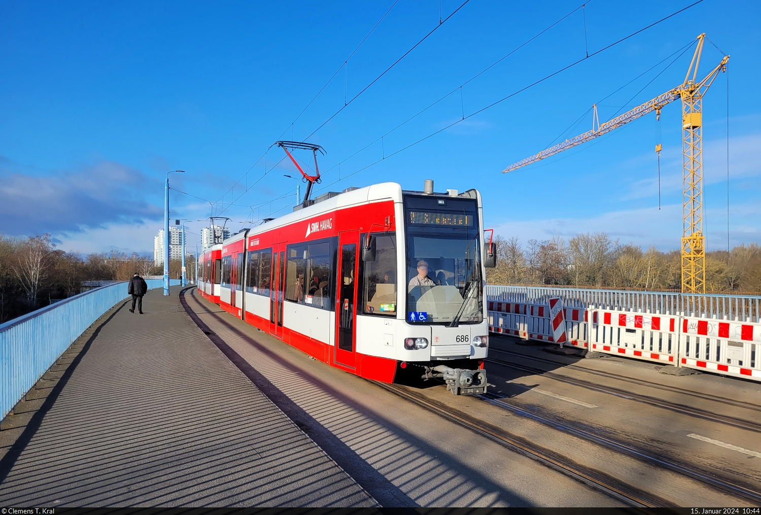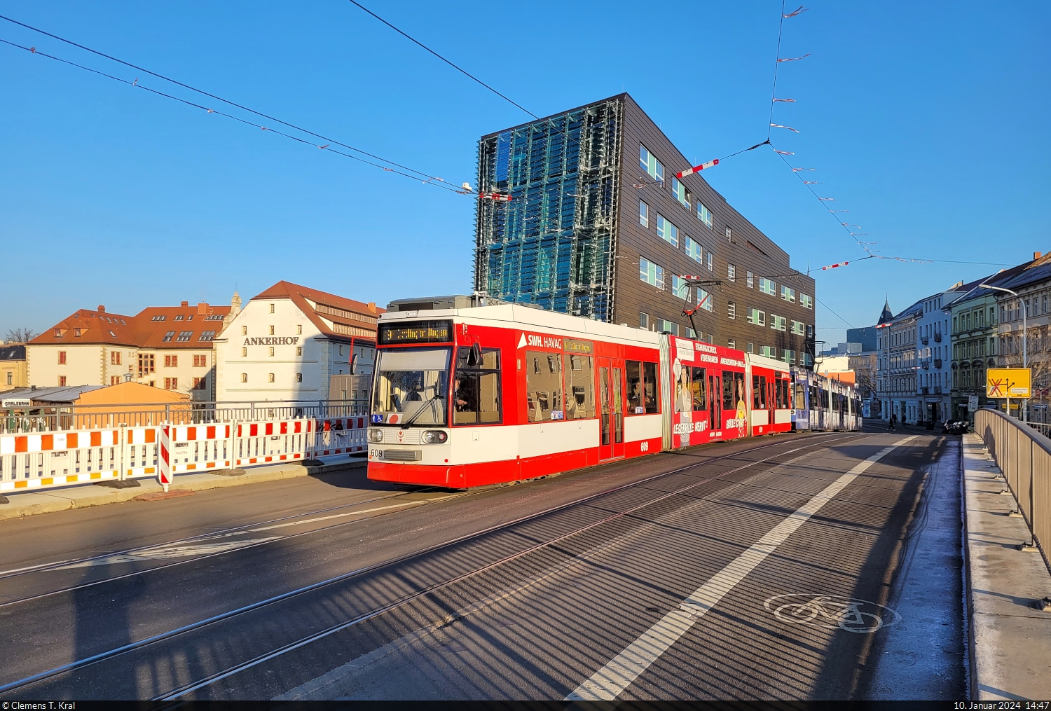 Links der Neuen Schieferbrücke auf der Mansfelder Straße in Halle (Saale) liegen das Hotel Ankerhof und das Mitteldeutsche Multimediazentrum. An beiden Gebäuden vorbei, Richtung Innenstadt, fährt gerade ein MGT-K-Doppel vom Typ Bombardier Flexity Classic, bestehend aus den Wagen 675 und 676. 🧰 Hallesche Verkehrs-AG (HAVAG) 🚋 Linie 2 Kröllwitz–Südstadt 🕓 10.1.2024 | 14:46 Uhr