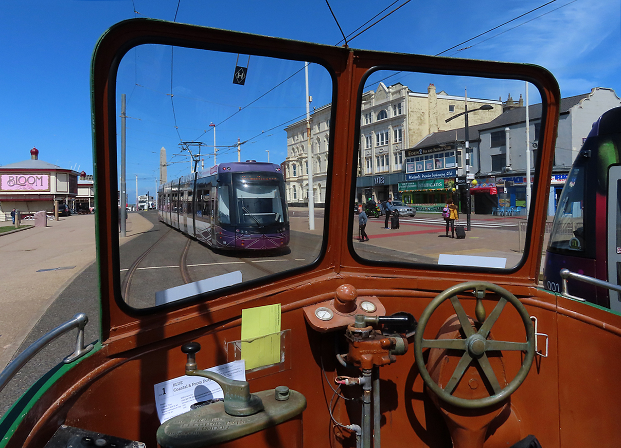 Blick an der Haltestelle North Pier vom Führerstand des offenen Heritage-Trams auf die moderne Flexity-Strassenbahn. Blackpool, 12.5.2022