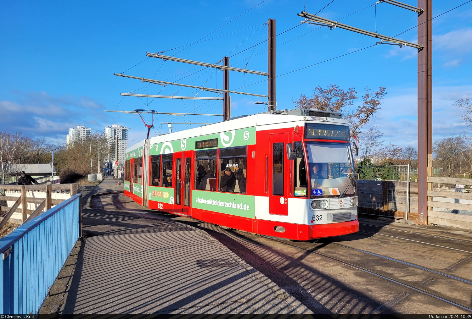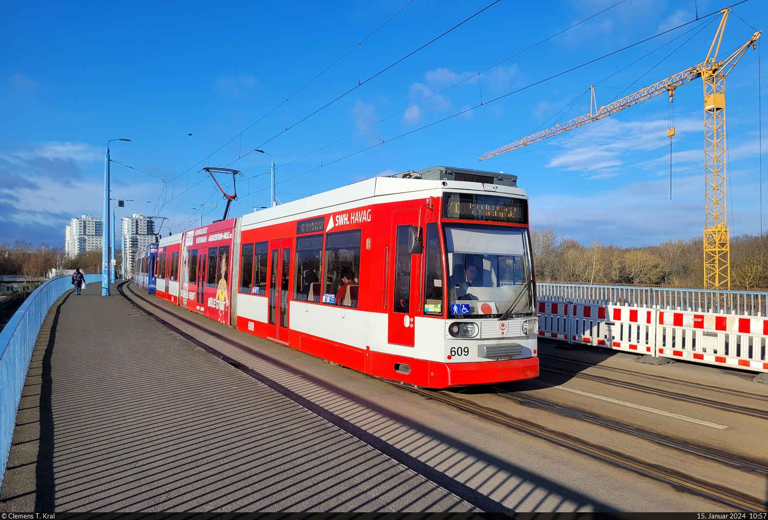 Am Hotel Ankerhof und Mitteldeutschen Multimediazentrum in Halle (Saale) wechseln Duewag/Siemens MGT6D, Wagen 609 und 602, die Saale-Seite. 🧰 Hallesche Verkehrs-AG (HAVAG) 🚋 Linie 9 Hauptbahnhof–Göttinger Bogen 🕓 10.1.2024 | 14:47 Uhr