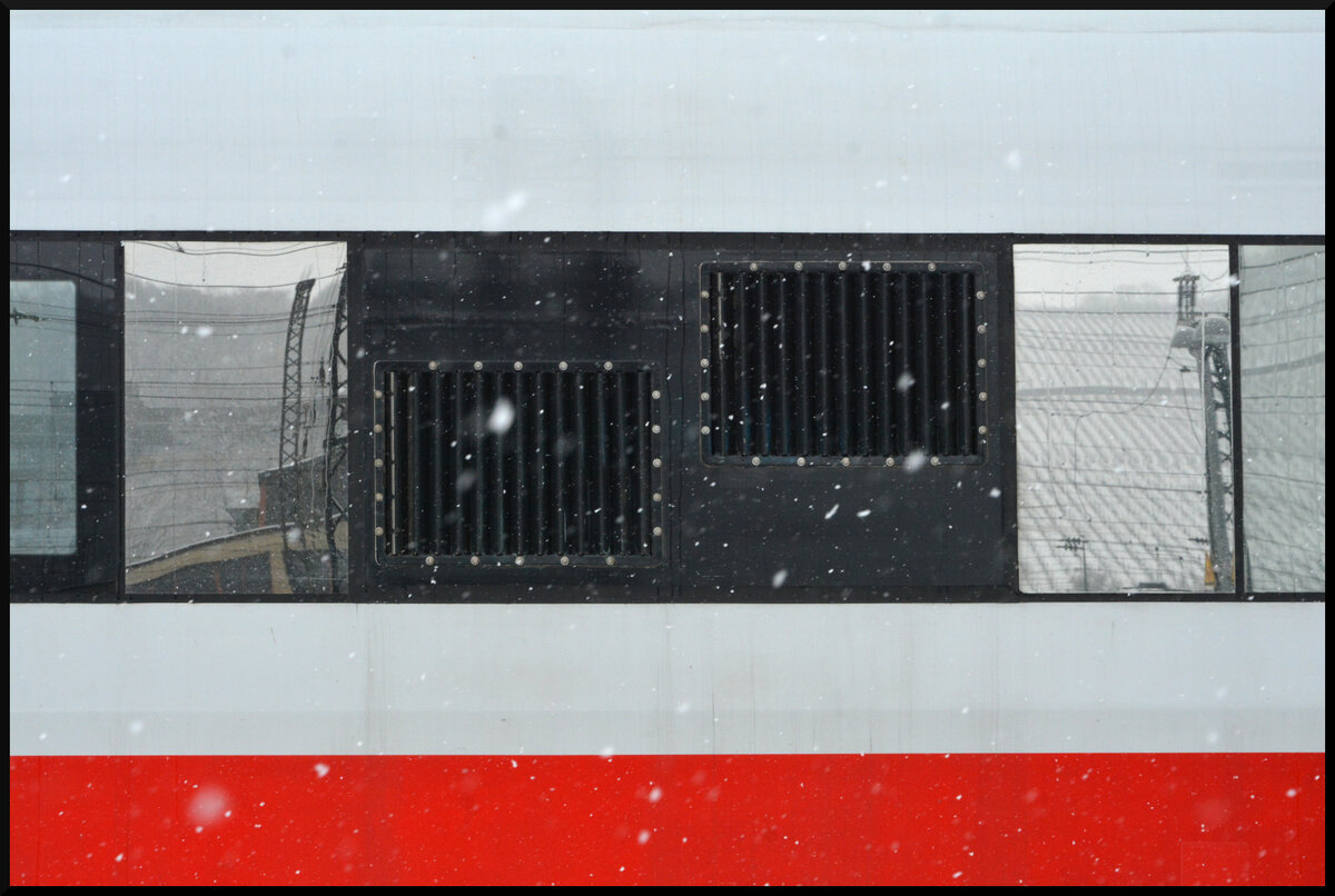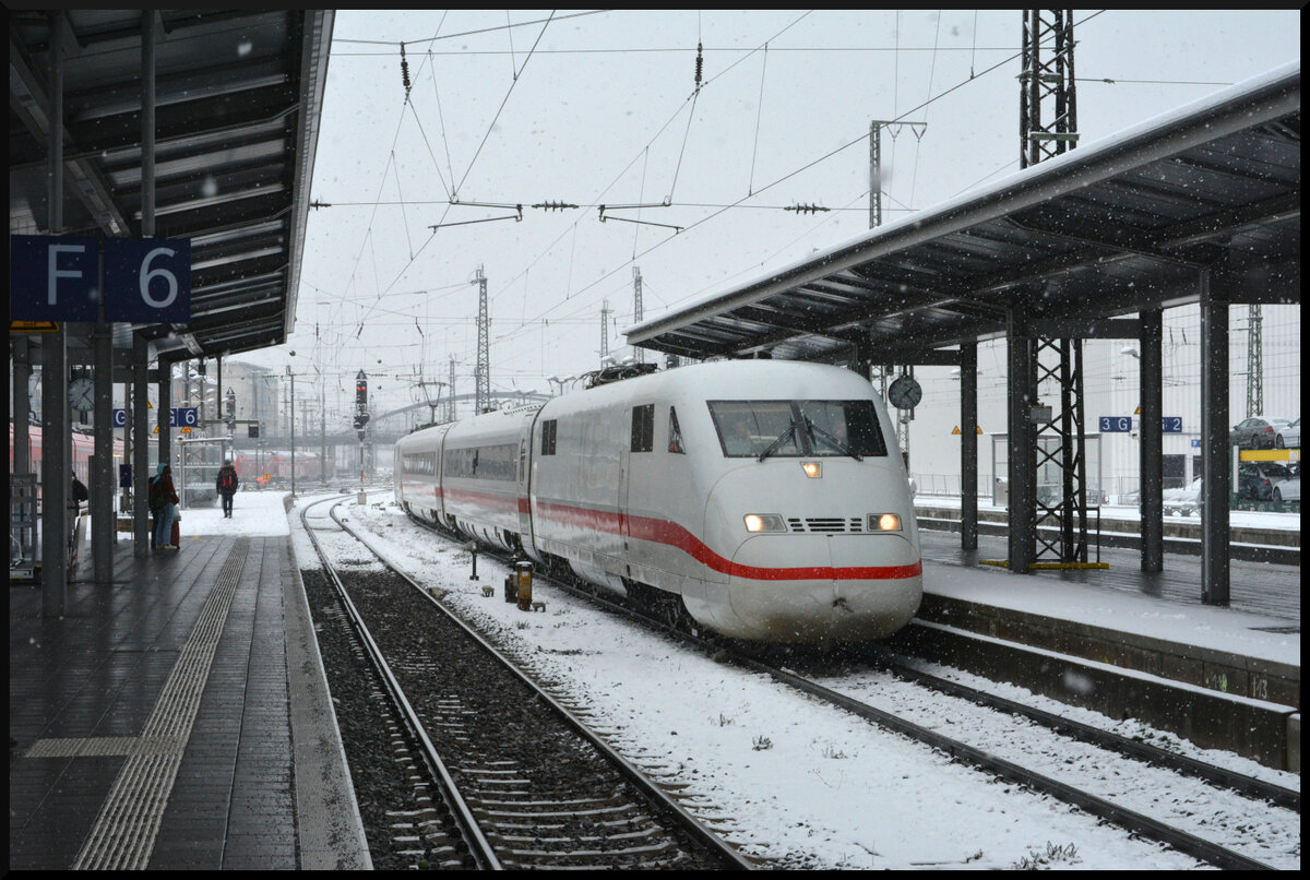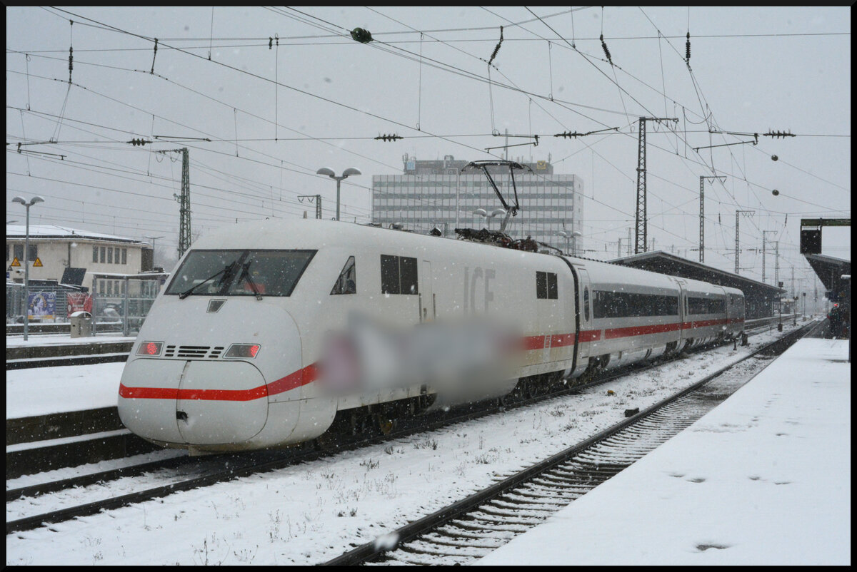 Am 18. Januar 2024 unternahm der ICE-S, der Versuchs- und Messzug der Deutschen Bahn, Oberleitungsmessfahrten auf der Schnellfahrstrecke von Würzburg nach Frankfurt am Main. Hier wartet der Zug im Würzburger Hbf auf die Abfahrt nach Lohr Bahnhof und hat soeben etwas Eisballast abgeworfen.