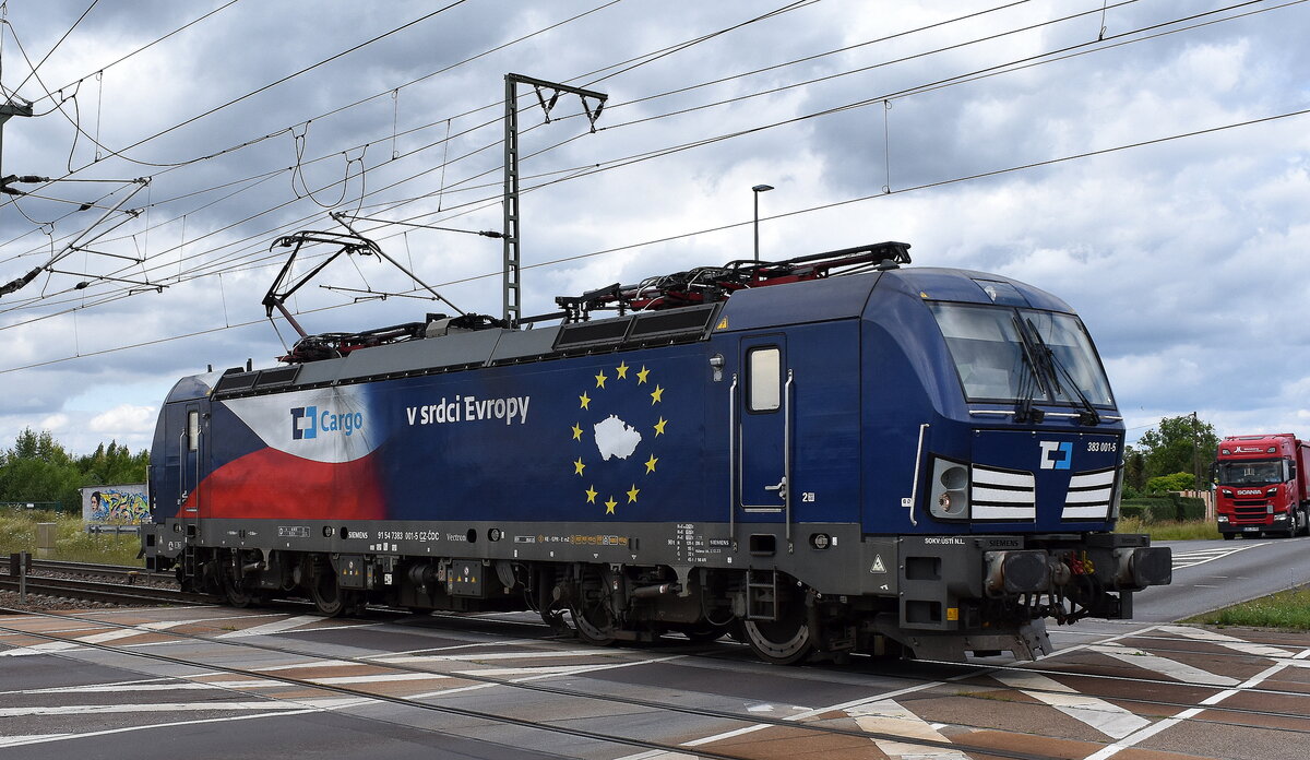 ČD Cargo a.s., Praha [CZ] mit ihrer "383 001-5" [NVR-Nummer: 91 54 7383 001-5 CZ-CDC] am 17.07.24 Bahnübergang Rodleben.