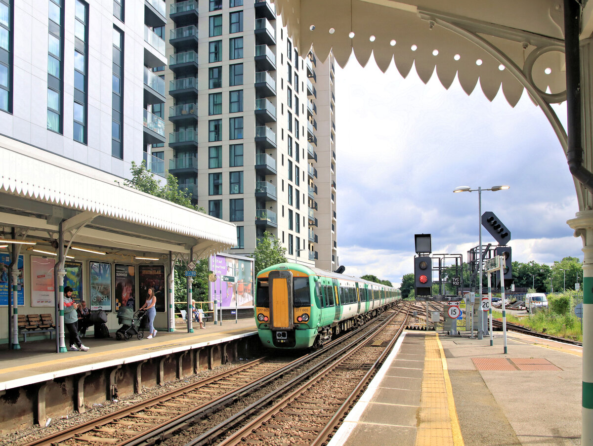 Class 377: Alt und neu, wie so oft in Grossbritannien - nostalgische Bahnhofsdächer und moderne Wohnblocks. Ausfahrt des Zuges 377 605, der nur für Gleichstrom/Dritte Schiene ausgerüstet ist, aus der Station Sutton. (Heutige) Southern Railway. 11.Juni 2024