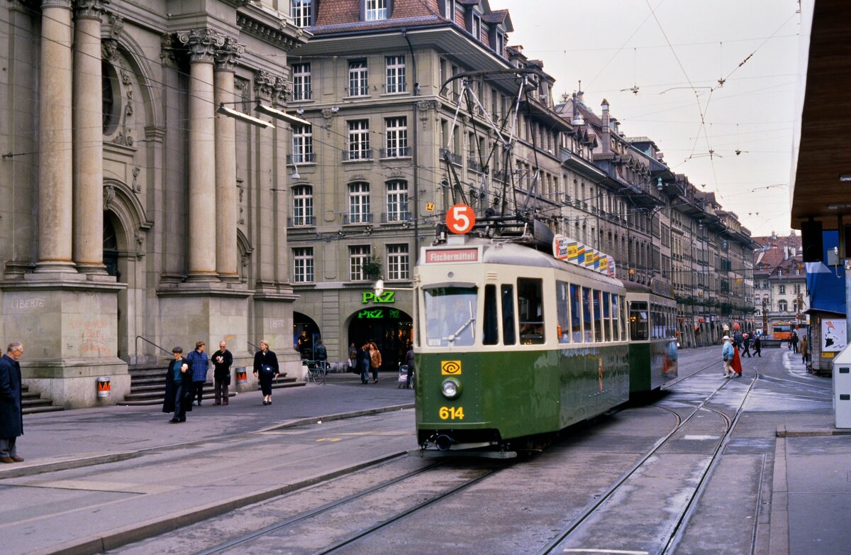 Schweizer Standardwagen der Straßenbahn Bern (1988) bei der Spitalgasse zwischen den Haltestellen Bärenplatz und Bern Bahnhof.