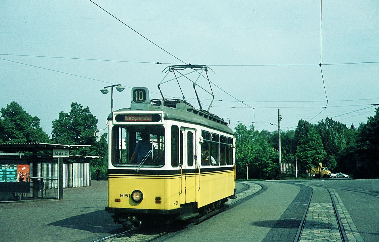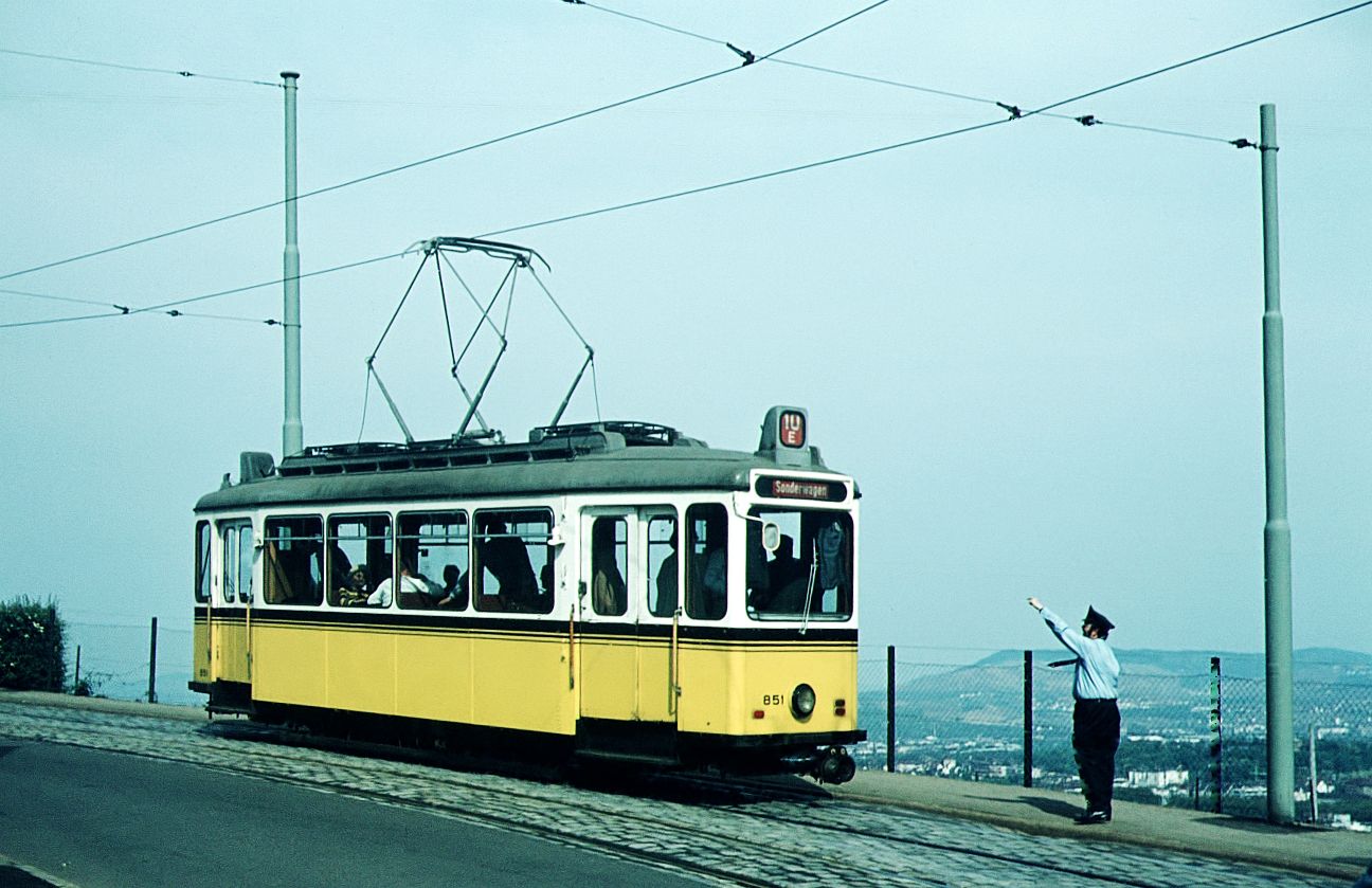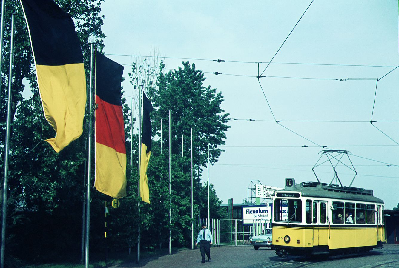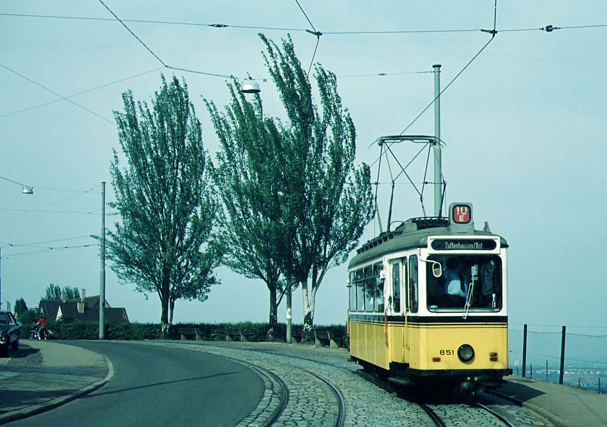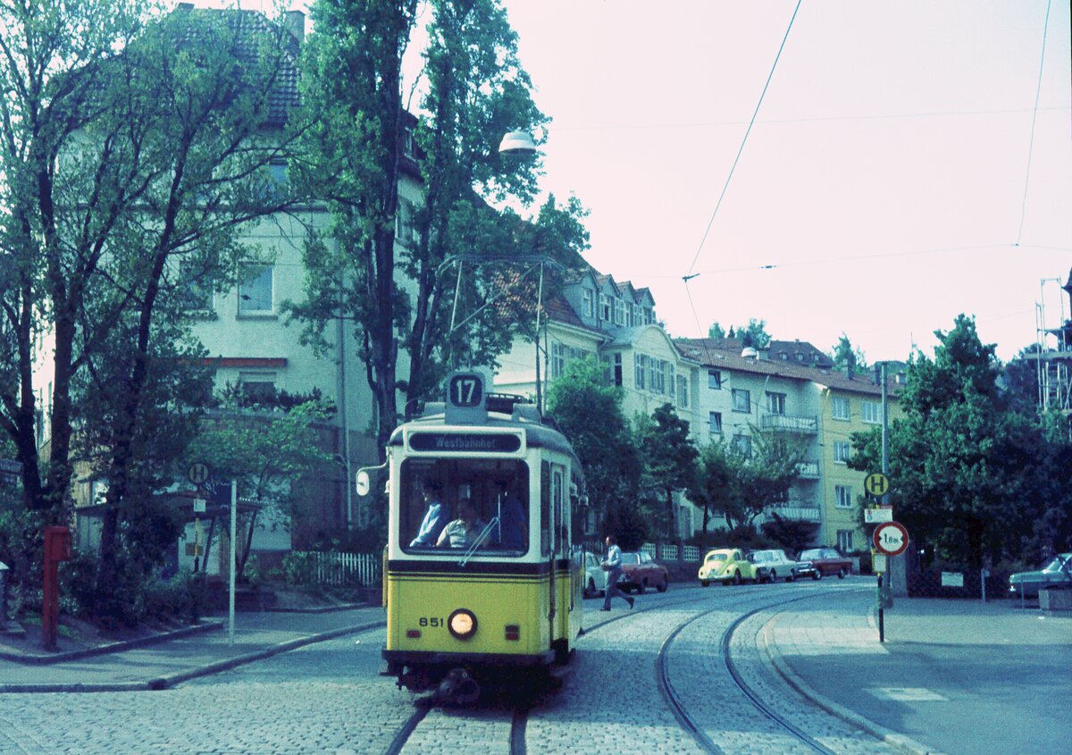 SSB Stuttgart__GS-Tw 851 auf Sonderfahrt, hier auf der aussichtsreichen Strecke zum Killesberg, wo 1939 die erste (Reichs-)Gartenschau stattfand. Die hierfür von Uerdingen und ME Esslingen gelieferten 24 Tw heißen bis heute "Gartenschau-Wagen"(GS).__05-05-1973