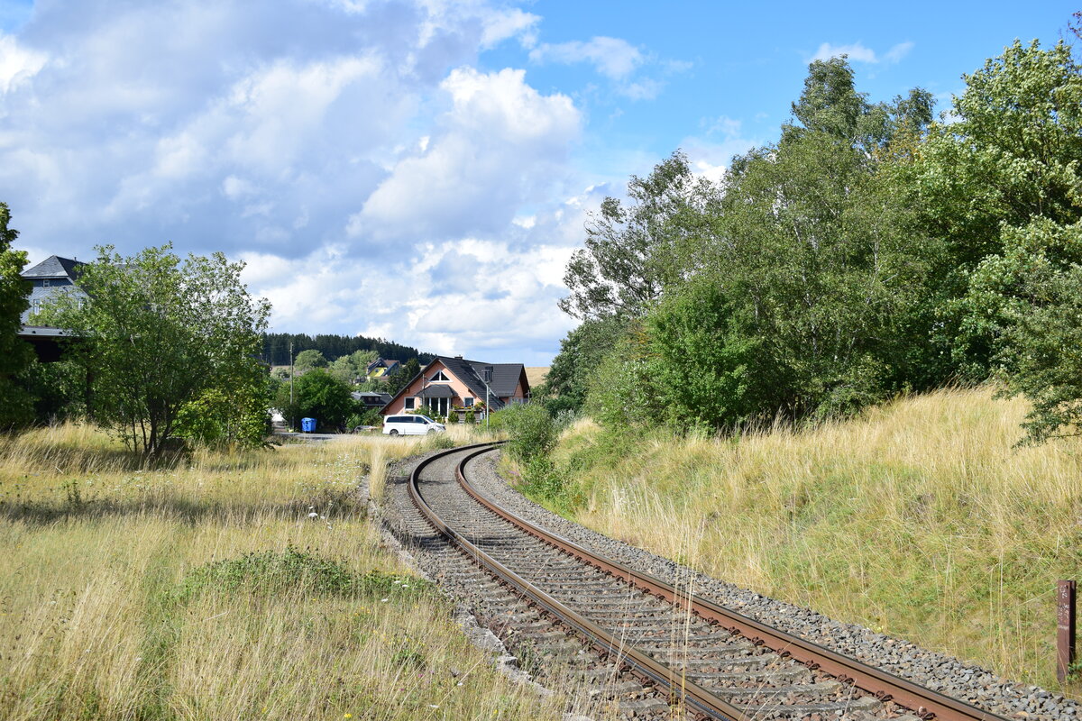 Blick auf den alten Haltepunkt Lückenmühle. Bis hier kann man heute von Ziegenrück aus mit der Draisine fahren. Der Personenverkehr wurde am 24. Mai 1998 eingestellt und der Güterverkehr wenige Monate später Ende 1998. Seit dem 1.1.2005 ist die Strecke offiziell stillgelegt.