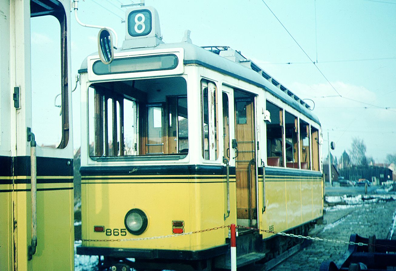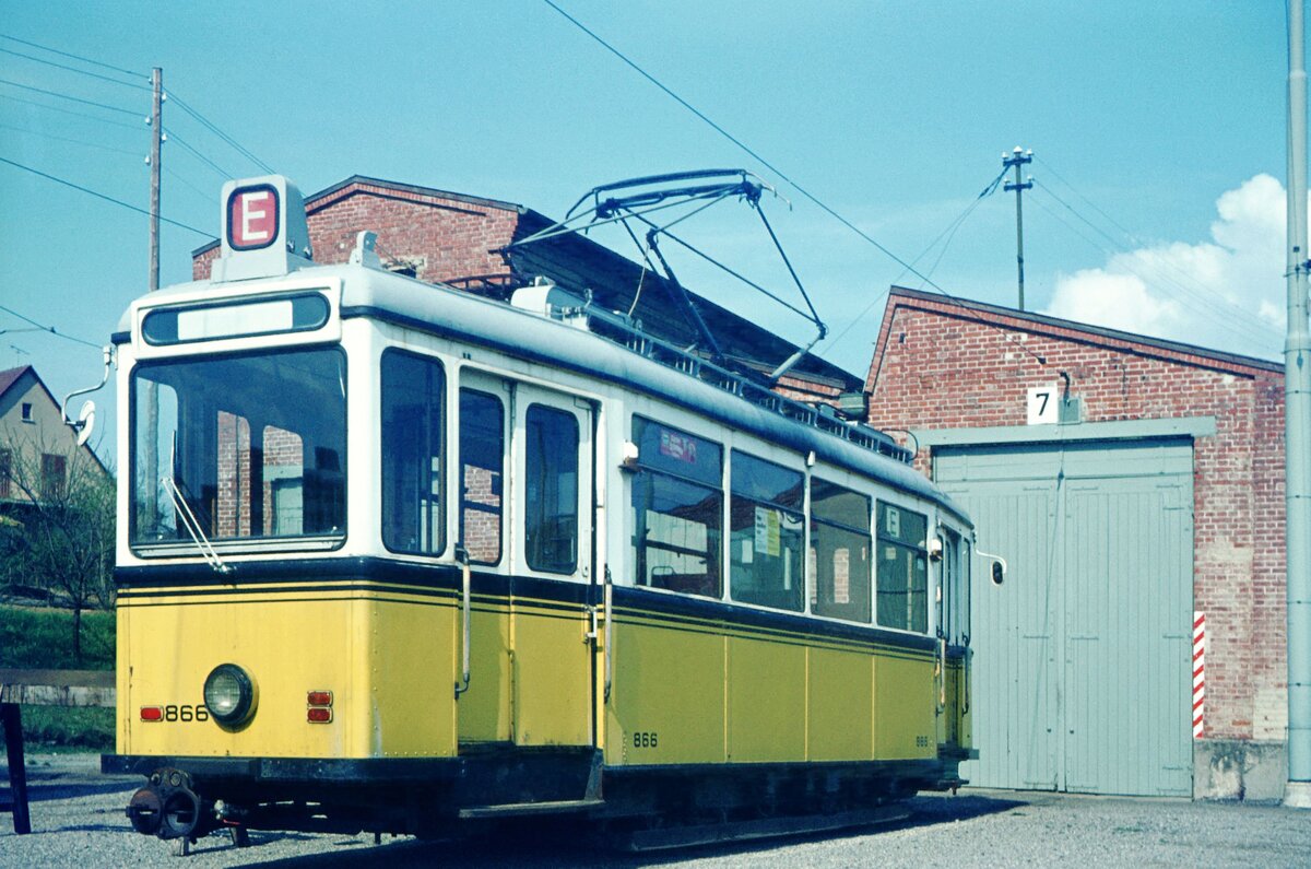SSB Stuttgart__Gartenschau-TW (GS) 861 [ME 1939] in der Früh-HVZ als E-Wagen nach Zuffenhausen am Leipziger Platz. Mit dem Einsatz als E-Wagen endete der Betrieb mit GS-Tw Anfang der 70er Jahre. Tw 861 wurde 1972 verschrottet.__14-04-1971