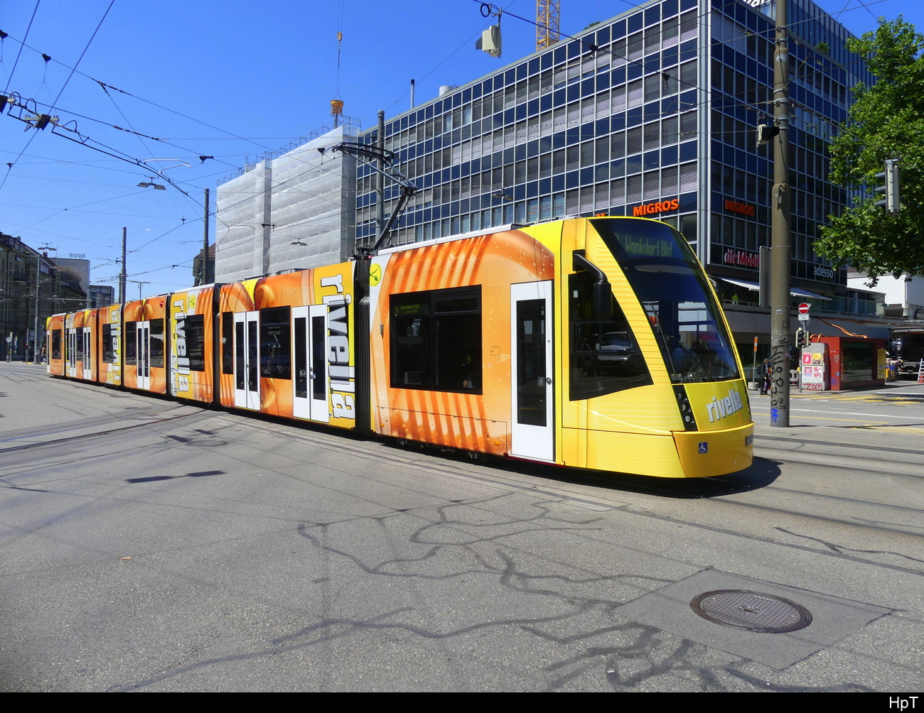 Be 6/8 Flexity 5015, auf der wegen einer Grossbaustelle zwischen Hardstrasse und Pratteln umgeleiteten Linie 14, fährt am 17.06.2024 zur Endstation M-Parc. Aufnahme Basel.