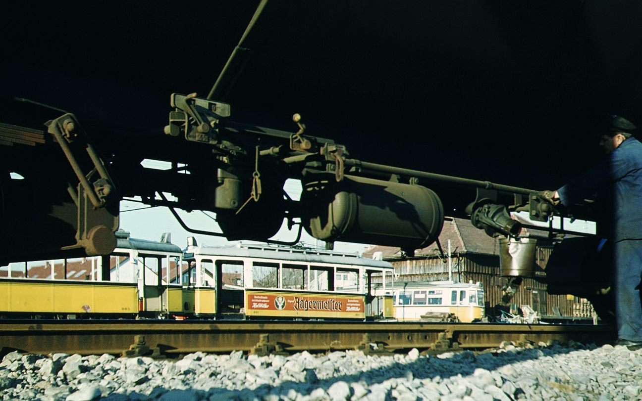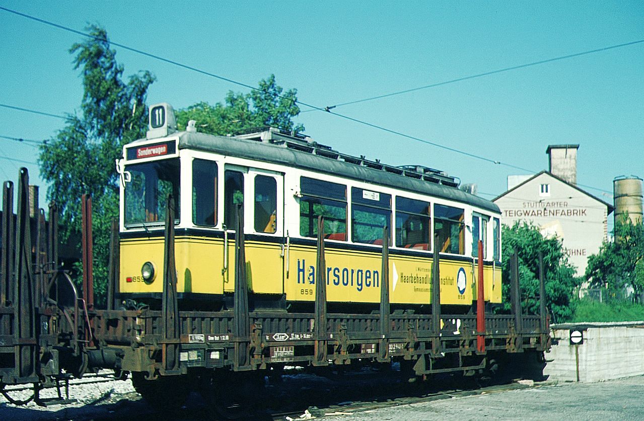 SSB Stuttgart__Gartenschau-TW (GS) 859 [ME 1939] geht auf Reisen, gemeinsam mit zwei 1300er Bw zum Straßenbahnmuseum Hannover. Im Bild 859 im Bf S-Möhringen, bereits auf Rungenwagen verladen. In Hannover stand der Wagen 30 Jahre lang meist im Freien, trotz seines traurigen Zustands wurde er 2003 von Stuttgarts Historischen Bahnen (SHB) zurückgeholt. Die Aufarbeitung zum GS im weitestgehend ursprünglichen Aussehen, auch mit seiner ursprünglichen Nr.714, dauert an. __06-08-1973