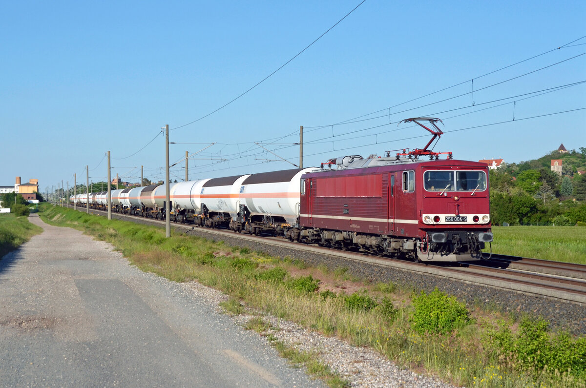 250 004 der Budamar West führte am Abend des 12.05.24 einen Kesselwagenzug durch Landsberg Richtung Halle(S).
