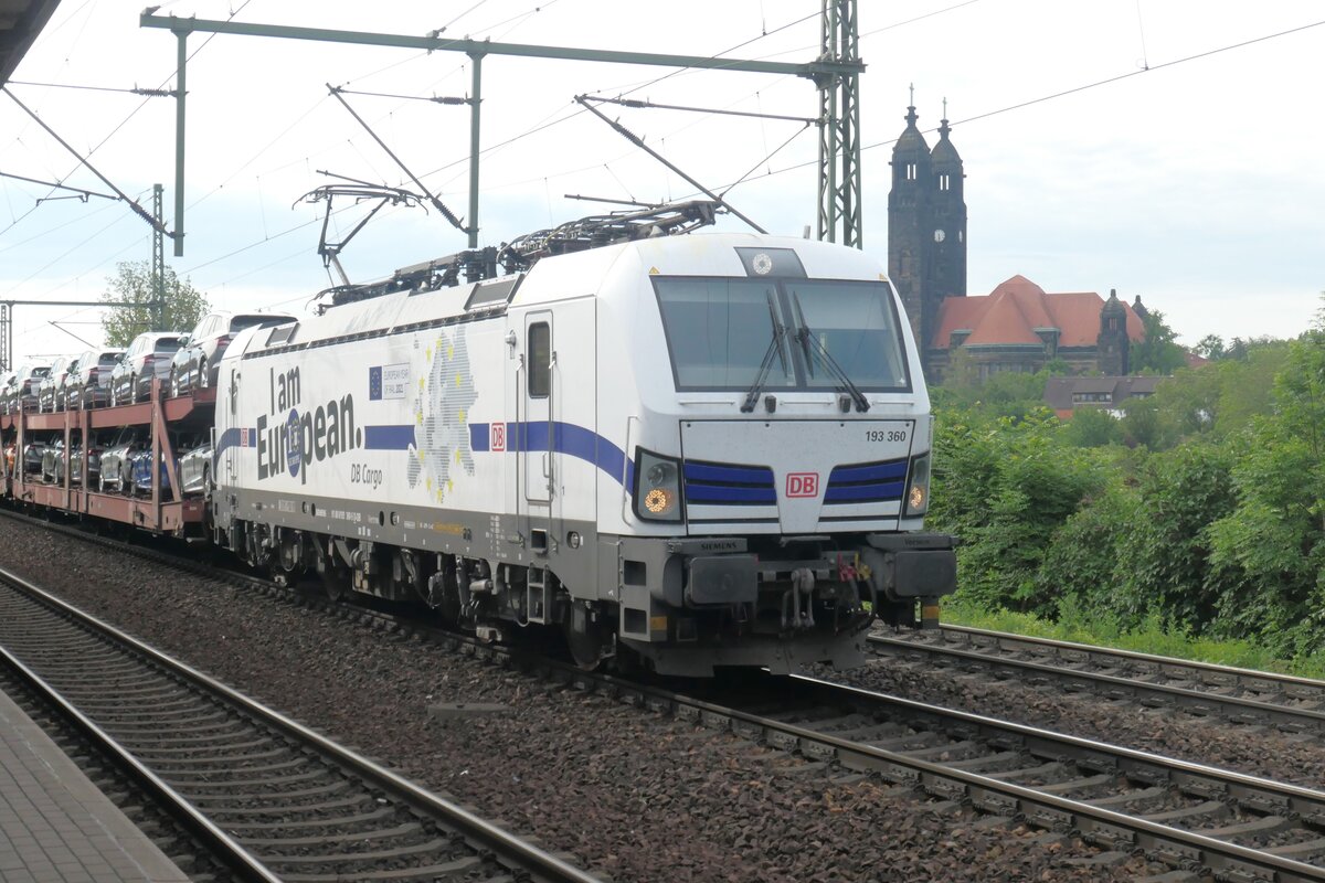 Pünktlich zum Besuch des französischen Präsidenten in Dresden, am 27.05.2024, führt die DB 193 360 mit der Europa-Beschriftung einen Autotransportzug durch Dresden-Strehlen mit der doppeltürmigen Christuskirche im Hintergrund