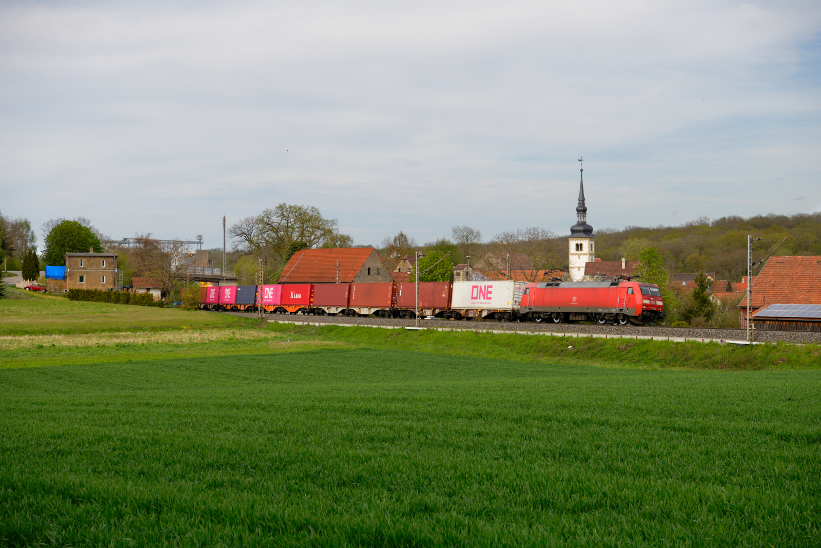 152 055 rollte am 12.05.24 mit dem DHL-Containerzug von Großbeeren nach Frankfurt(M) durch Landsberg Richtung Halle(S).