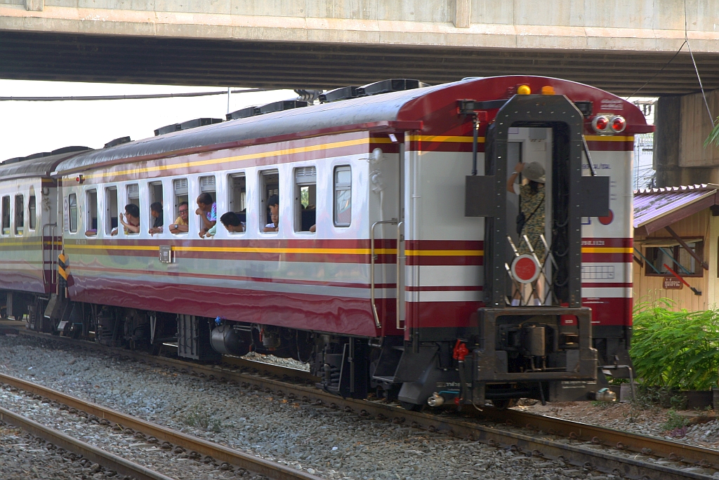 บชส. 1121 (บชส. =BTC./Bogie Third Class Carriage) am 26.März 2024 als letztes Fahrzeug des dem Sonderzug 902 (Ayutthaya - Hua Lamphong) kurz nach der Ayutthaya Station.