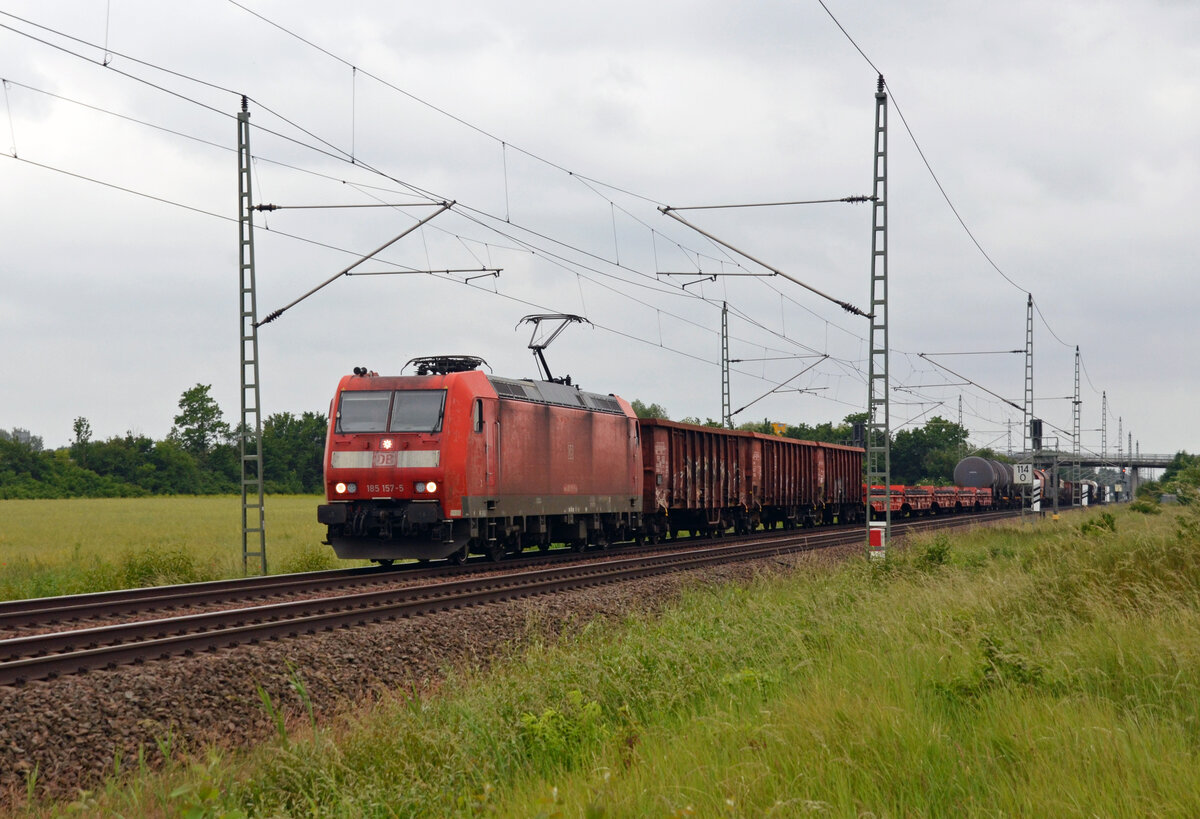 Mit einem gemischten Güterzug rollte am 02.06.24 185 157 durch Gräfenhainichen Richtung Wittenberg.