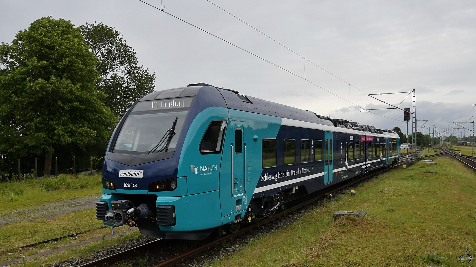 Der als RE72 verkehrende Akkutriebzug 826 046 ist hier bei der Ankunft am Bahnhof in Flensburg zu sehen. (Juni 2024)
