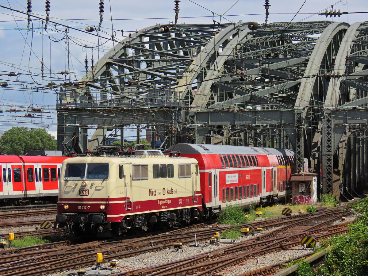 Außerplanmäßig über die Kölner S-Bahnstrecke ist 111 074 mit einer 4-Wagen Dosto Garnitur in Touristik Lackierung als EM Sonderzug von Köln nach Dortmund unterwegs. Ganz herzlichen Dank geht hier an den Lokführer, der dieses Foto durch die langsame Einfahrt nach Gleis 10 am Kölner Hbf ermöglicht hat. Sonst hätte der RE9 den Sonderzug zugefahren. Juni 2024