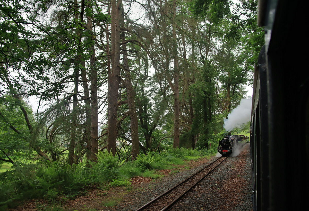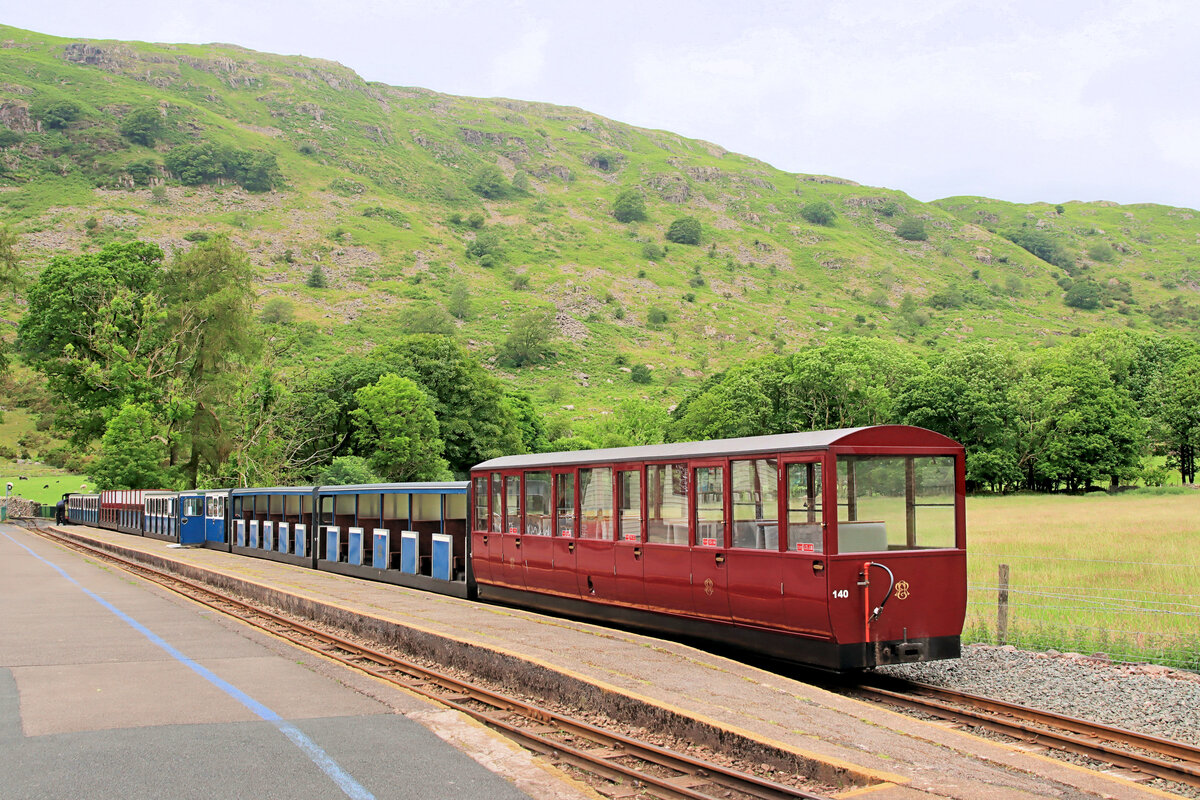 Die Ravenglass & Eskdale Schmalspurbahn in Nordwest-England: Diese Bahn hat die extrem kleine Spurweite von 381 mm, ist 11, 3 km lang und führt weit ins Bergtal hinauf, wo einst Eisenerz und Granit abgebaut wurde. Bereits 1875 entstand hier eine Bahn mit 914 mm Spurweite, die 1913 stillgelegt wurde. 1915 übernahm der für seine Modell- und Miniatureisenbahnen berühmte W.J.Bassett-Lowke die Linie und spurte sie auf 381 mm (15 inch) um. Mit einer Reihe von Bassett-Lowke Loks wurden nun Güter-, Post- und Personenzüge geführt, sowie Granitblöcke von den dortigen Bergwerken transportiert. 1953 gaben die Granit-Bergwerke auf, und 1960 stand die Bahn zum Verkauf. Hier übernahm jetzt die Ravenglass & Eskdale Preservation Society (Museumseisenbahn-Gesellschaft). Im Bild steht eine Zugskomposition weit hinten im Tal in Dalegarth; der Zug setzt sich aus ganz verschiedenen Wagen zusammen, geschlossenen, offenen, solchen ohne Dach, und zuhinterst einem der 3 neuen Erstklasswagen (bei den Ffestiniog-Bahnen gebaut). 13. Juni 2024