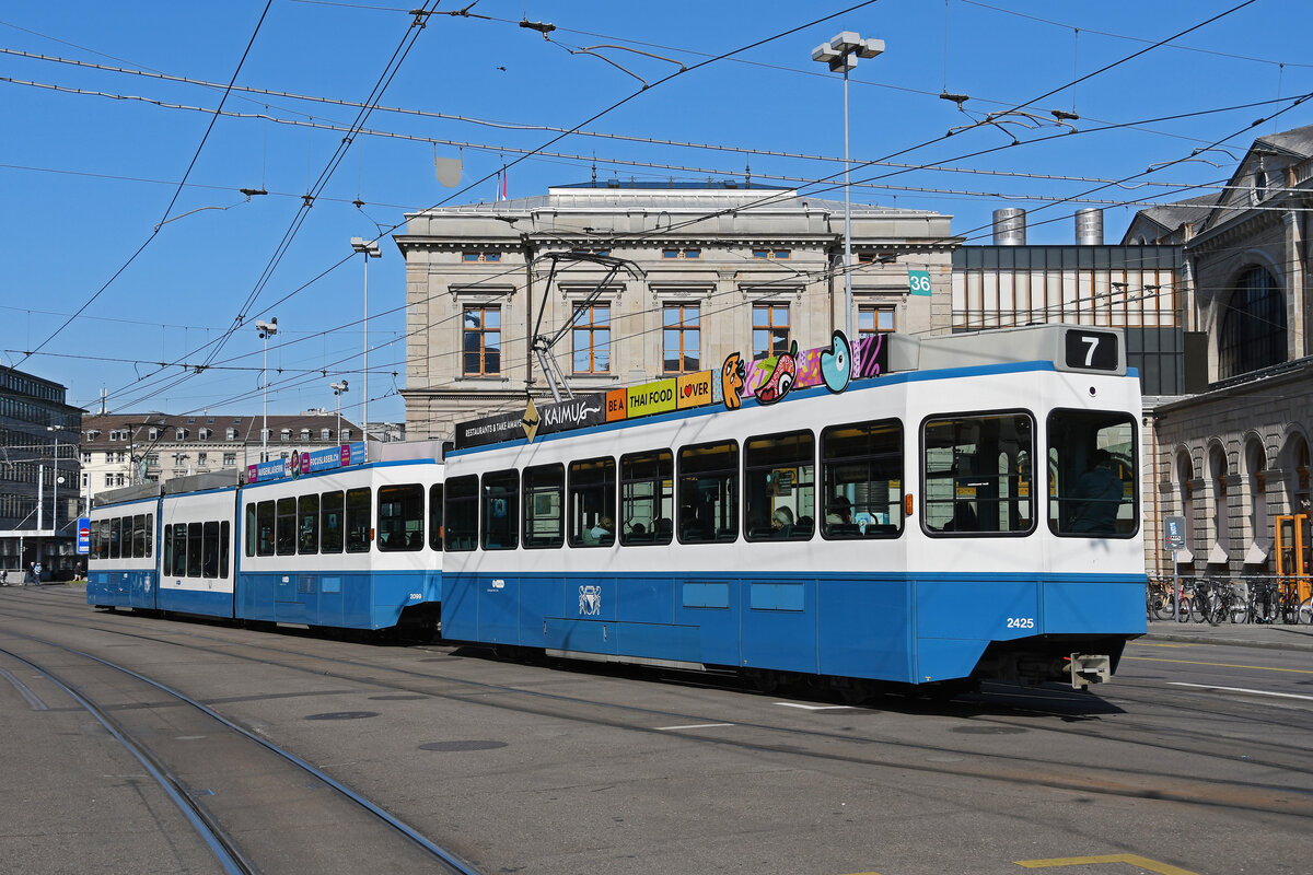 Doppeltraktion, mit dem Be 4/6 2099 und dem Be2/4 2425, auf der Linie 7, fährt am 12.04.2024 zur Haltestelle beim Bahnhofplatz in Zürich.