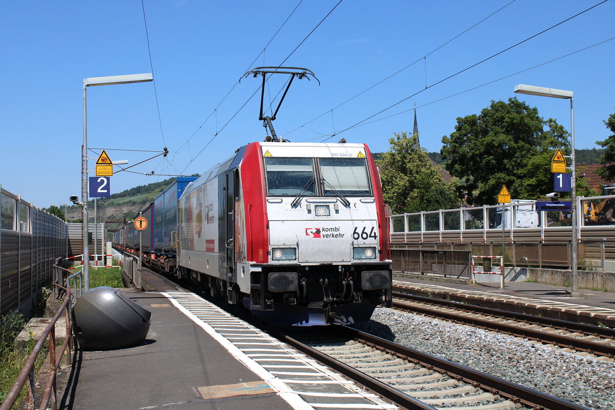 Lokomotion 185 664 mit einem Paneuropa-KLV Richtung Würzburg, am 25.06.2024 in Thüngersheim.