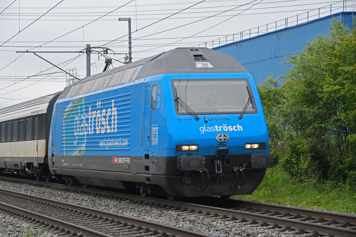 Re 460 011-0 mit der Werbung für Glas Trösch, fährt am 03.06.2024 Richtung Station Itingen.