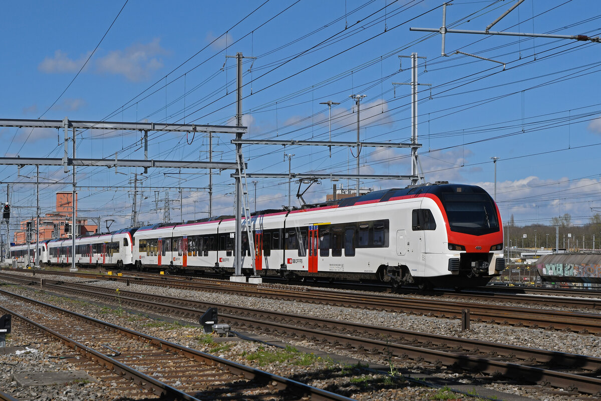 RABe 523 506-9 Mouette durchfährt am 25.03.2024 den Bahnhof Muttenz.