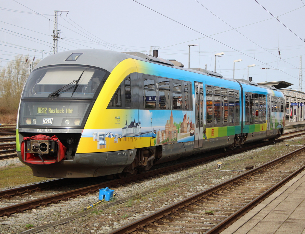 Der im Mecklenburg-Vorpommern Design Neu gestaltete 642 533 als RB 12 von Graal-Müritz nach Rostock Hbf bei der Einfahrt im Rostocker Hbf.30.03.2024