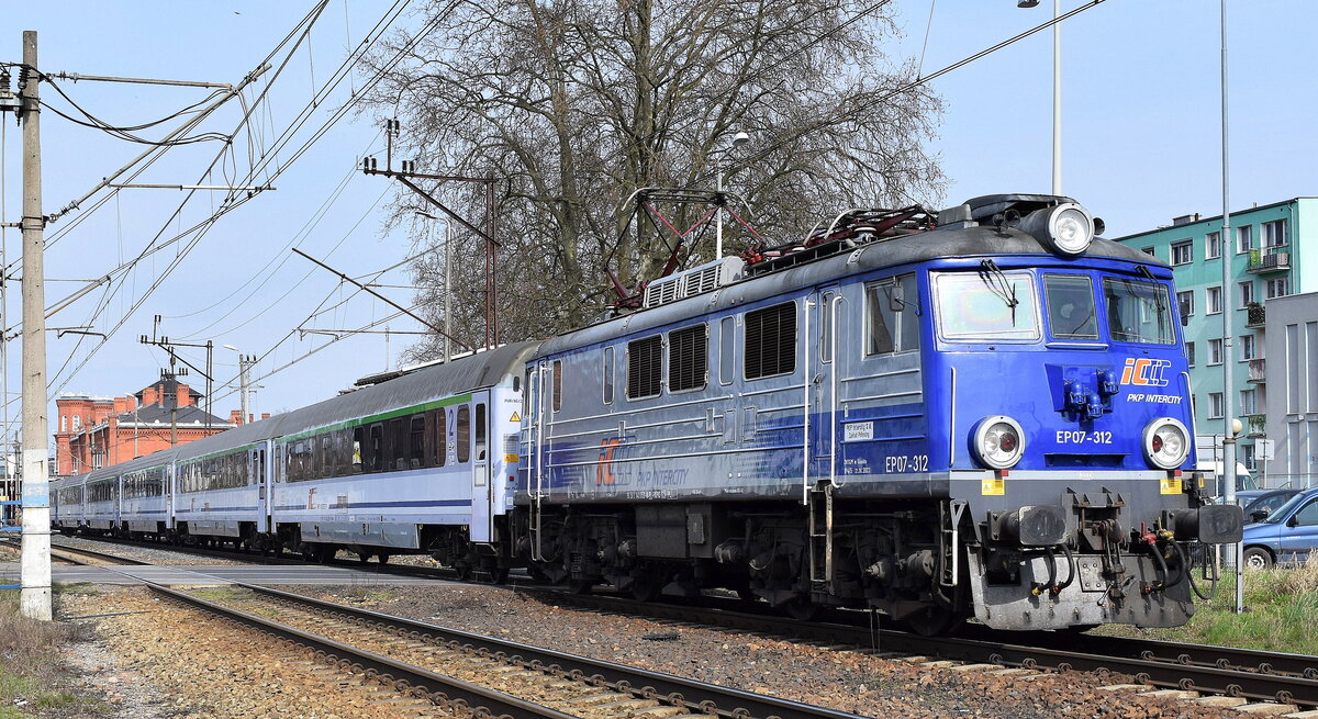PKP Intercity spółka z o.o., Warszawa [PL] mit ihrer "EP07-312" (NVR: "91 51 1 140 052-8 PL-PKPIC") und einem IC bei der Ausfahrt Bahnhof Kostrzyn nad Odrą am 20.03.24
