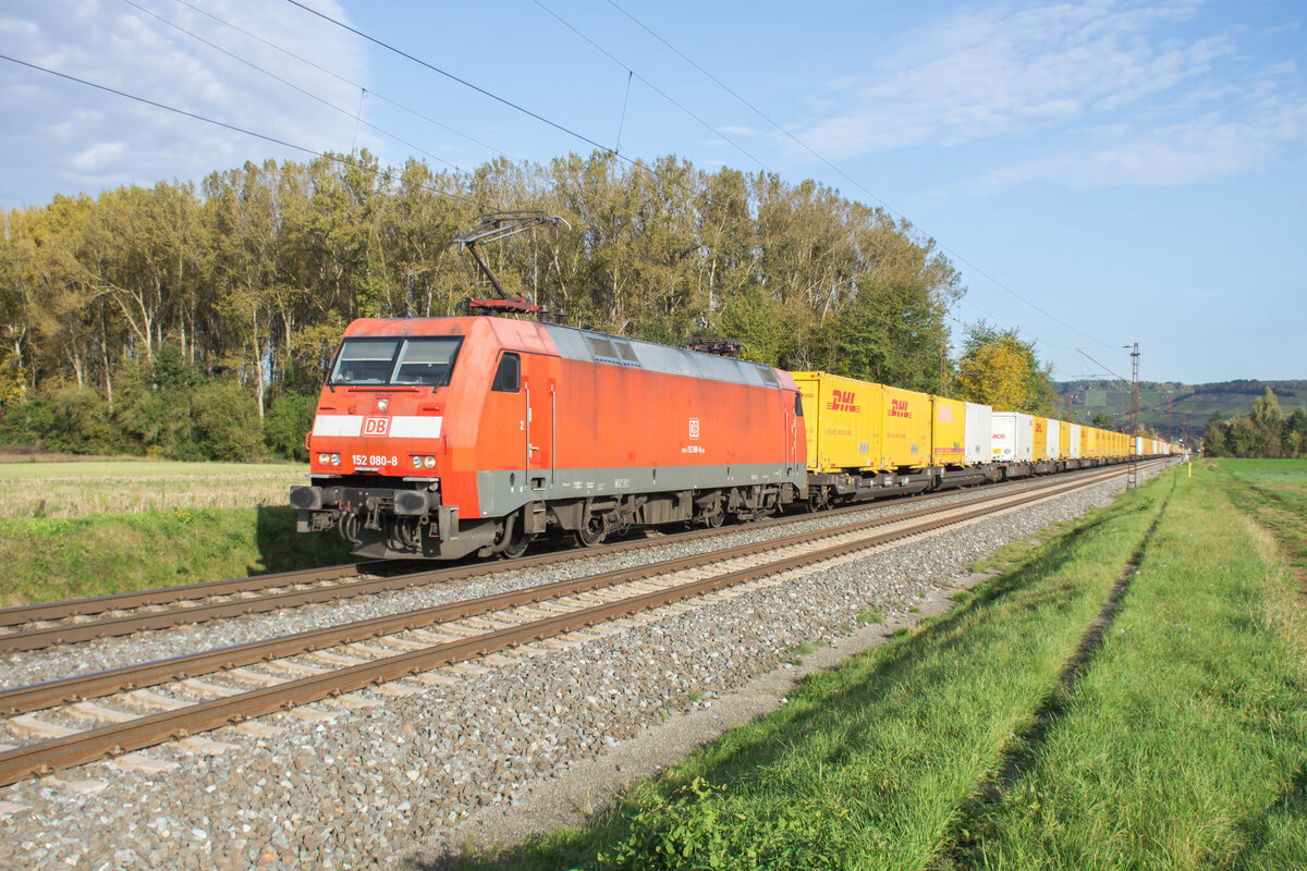 152 080-8 mit einem DHL-Zug bei Retzbach-Z. am 16.10.2024.