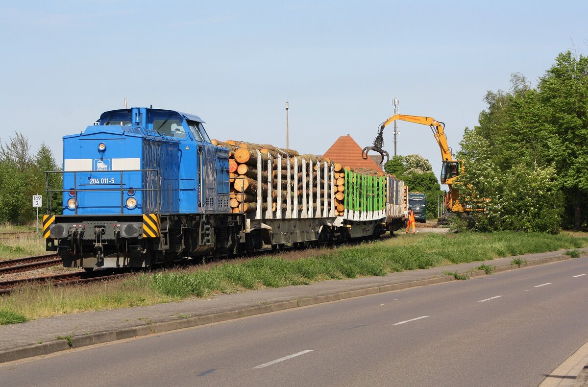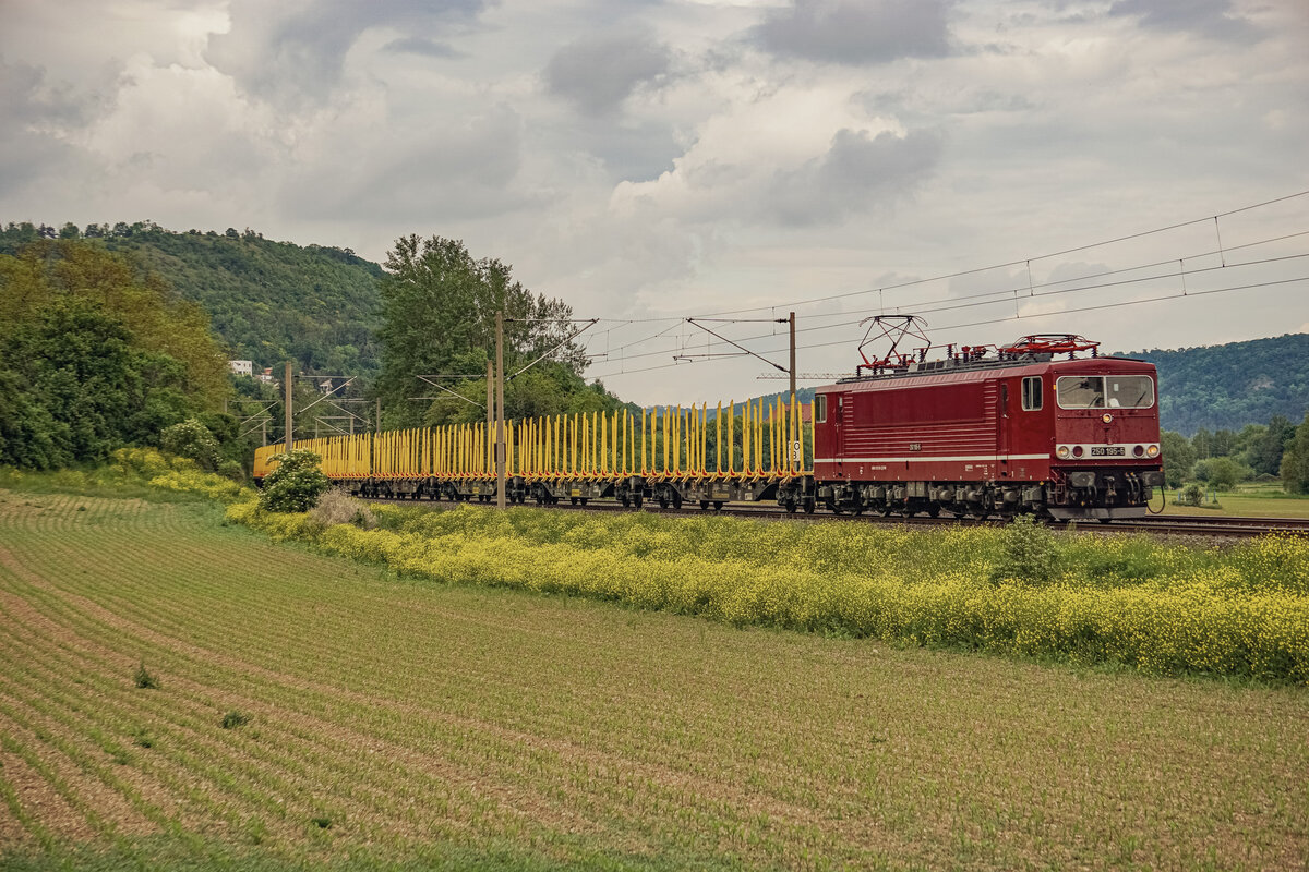 155 195 im Dienste des Erfurter Bahnservice fuhr am 18.05.2024 mit einem Holzwagenzug durch Porstendorf in Richtung Jena und bestimmt weiter nach Saalfeld.