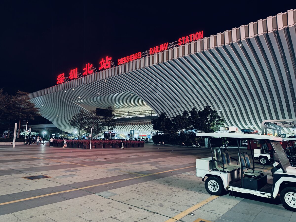 2024.10.27, ShenZhen N. Station (Metro side). The opening in middle of the roof was where the SZ Metro L4 runs, impossible to see here but L6 was after L4's platform. Access to CR's HSR station was at ground level. This massive roof does has practical use to fully cover the area below where passenger interchange between underground and overground section. /// 2024.10.27, ShenZhen N. Station (Metro-Seite). Die Öffnung in der Mitte des Daches war die Stelle, an der die SZ-Metro-Linie L4 verkehrt, hier nicht zu sehen, aber L6 befand sich hinter dem Bahnsteig der L4. Der Zugang zur HSR-Station der CR war ebenerdig. Dieses massive Dach hat einen praktischen Nutzen, da es den Bereich, in dem die Fahrgäste zwischen dem unterirdischen und dem oberirdischen Teil umsteigen, vollständig abdeckt.