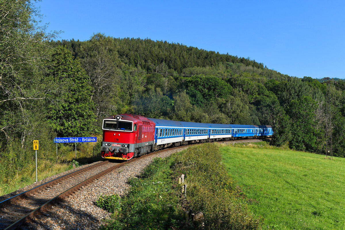 Kurz nach Verlassen des Bahnhofs Hojsova Stráž - Brčálník konnte ich die 754.064 mit dem R 775  Berounka  nach Praha hl.n. aufnehmen. Der Fünf-Wagen-Zug mit teilweiser Klimatisierung verlangt der  Taucherbrille  auf den Steigungen im Böhmerwald einiges ab. Ähnlich wie die Loks der Baureihe 218 bei den DB sind die markanten tschechischen Maschinen am Ende ihrer Nutzungsdauer angekommen und der Schadbestand ist hoch.