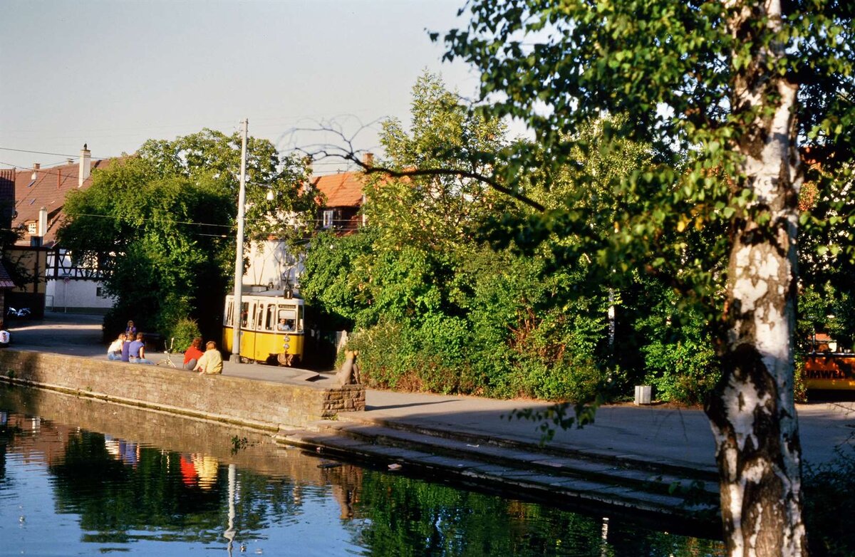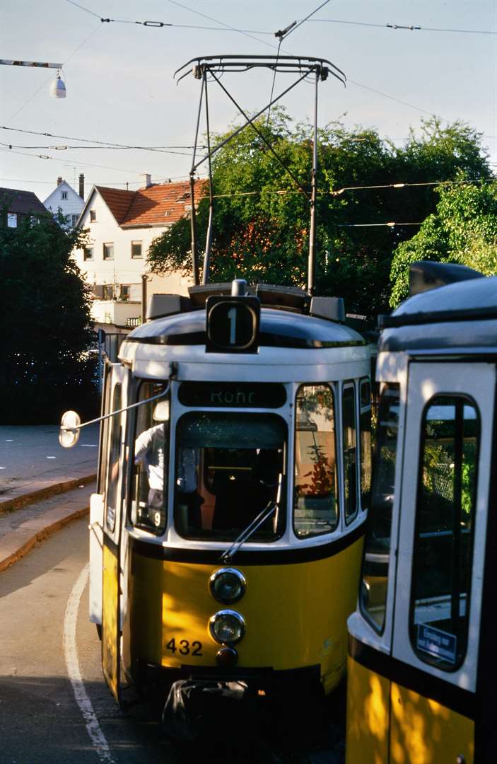 Der Stuttgarter Straßenbahnzug mit TW 432 und Beiwagen war auf der Schleife der Linie 1 schon ziemlich nahe an den Zug vor ihm herangefahren.