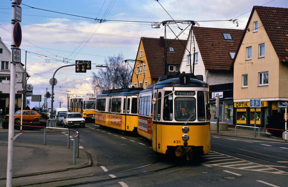Der Stuttgarter Straßenbahnzug mit TW 432 und Beiwagen war auf der Schleife der Linie 1 schon ziemlich nahe an den Zug vor ihm herangefahren. Datum: 26.03.1986