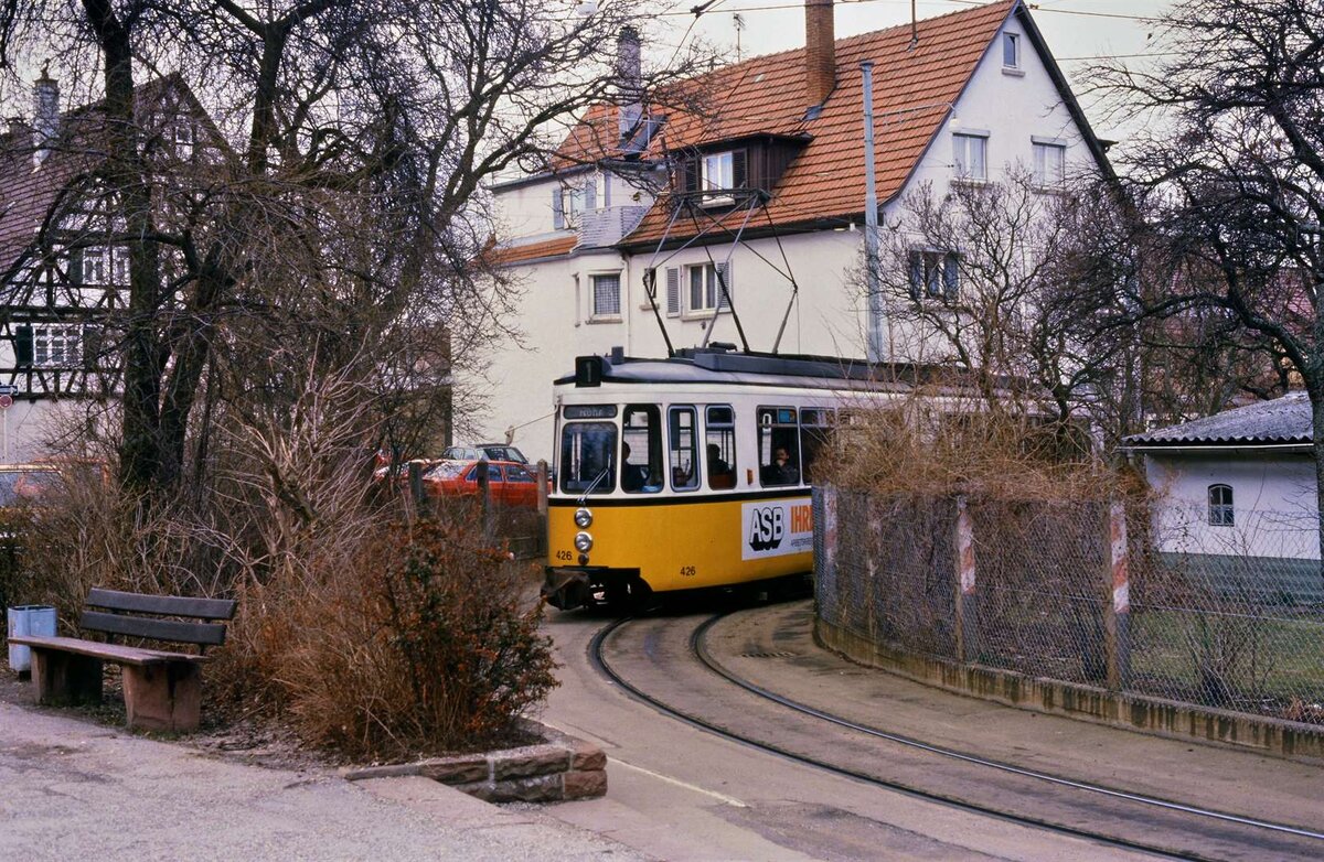 Rohr: Ein Stuttgarter GT4 Straßenbahnzug unmittelbar vor der engen Schleife der Linie 1. Datum: 26.03.1986