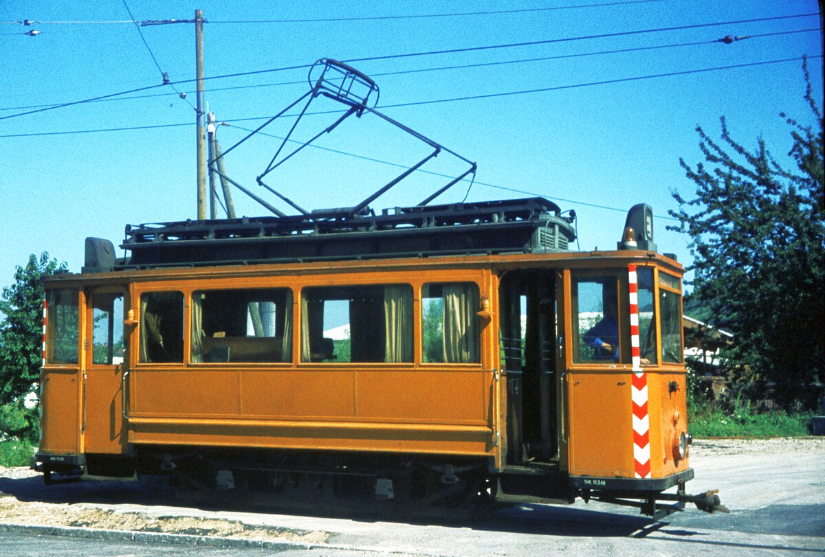 Straßenbahn Reutlingen__ATw 31 auf dem Abzweiggleis zum Südbhf.  Nur ein Arbeitswagen ,aber mit Geschichte ! [ME 1912 für die Straßenbahn Eßlingen; 1944 zur SSB als Tw 565; 1949 nach RT als Tw 31, spätestens ab 1966 als ATw in orange; 1974 Sammlung Pollitzer; 1980 ins DSMH e.V. Wehmingen; 1992 nach Zwickau,Umbau in Krakau zum  historischen  Bw 17. [Quelle: Homepage der Freunde des Nahverkehrs Zwickau e.V.].__29-07-1974